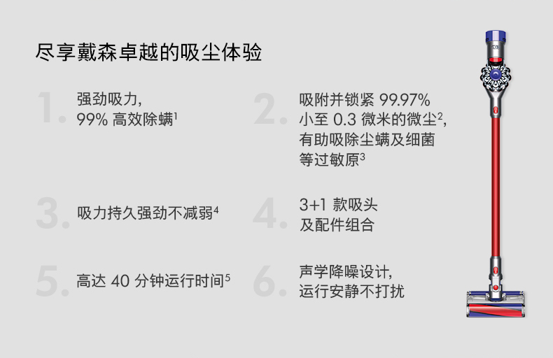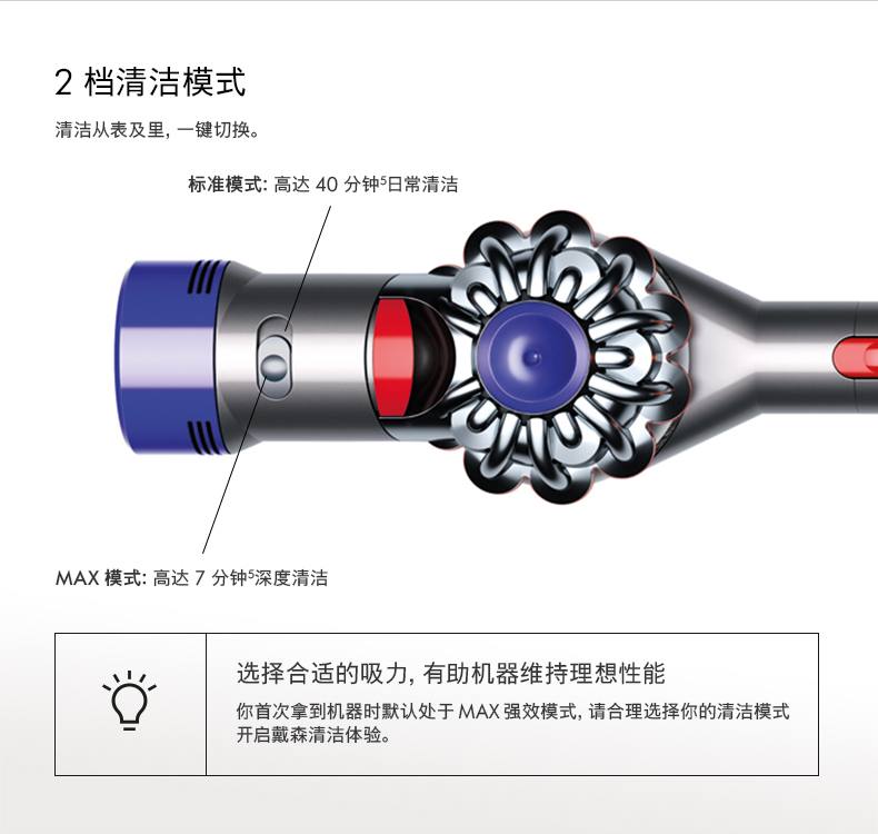 首先是主机,采用戴森第八代数码马达,比起V6的第六代马达,吸力更为强劲。清洁范围不仅限于光滑地板,在地毯/缝隙/床褥方面也有不错表现。比起V6,V8采用了6个无衰减锂离子电池供电,运行时间提升至40分钟,机身带有电量指示灯。
