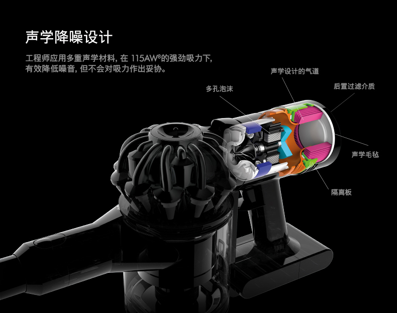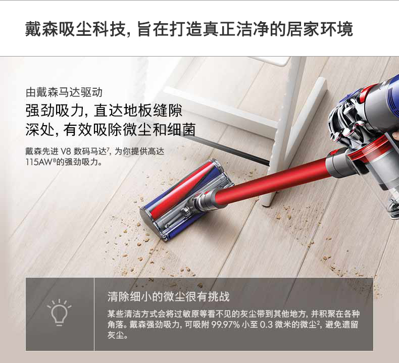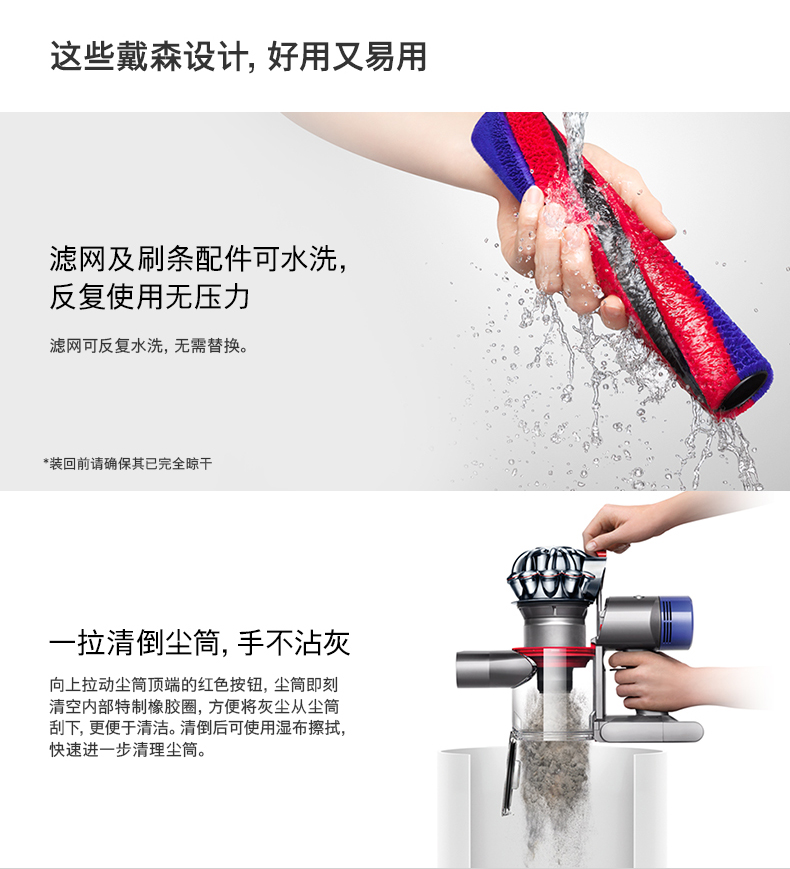 原有的Tier Radial 放射式气旋结构,结合整机HEPA过滤系统,能够吸附99.9%小至0.3微米的颗粒物,带上后置的马达滤网,使V8排出的空气更为洁净。全新的集尘筒清空设计也是亮点,新的清空集尘筒设计只需上拉红色按钮,就能一步清空尘垢和碎屑,无需接触尘垢。噪音方面,比起上代减少一半。