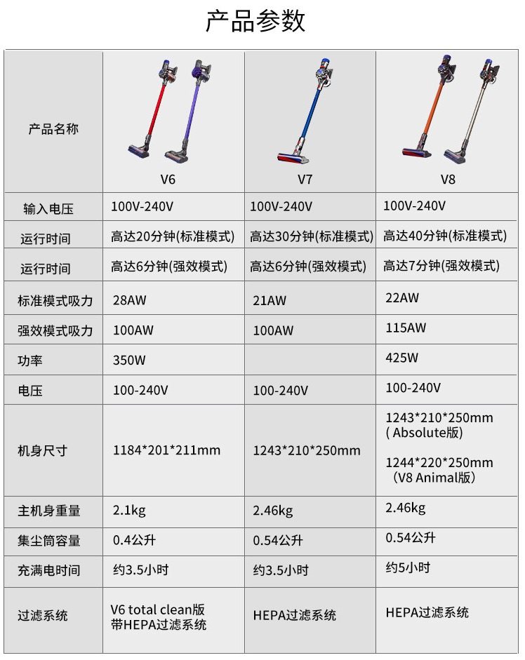 戴森第一代吸尘器,如DC35与DC45,机身配置是有差别的,第二代吸尘器本质上是机身的升级,吸头只升级了一款。而当前第三代V6吸尘器,机身配置与第二代本质是一样的,都是第六代数码马达,吸力最高都是100AW,戴森V6的本质是推出了三款全新的吸头。