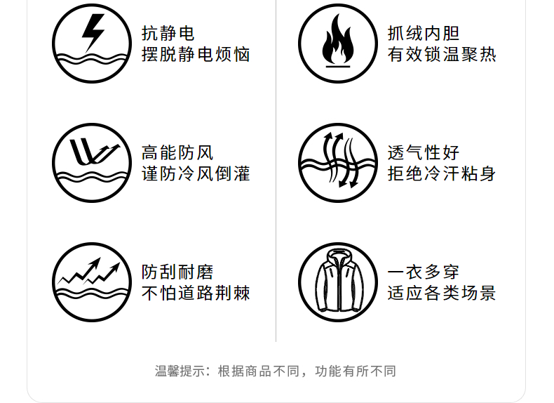 细节上:双门禁设计,所有拉链都采用防水压胶处理,防钻风防雨水渗透,保护体表温度不流失。内胆抓绒,加厚设计,摇粒饱满细腻,蓬松度高,回弹性好,比普通摇粒绒更紧实,不易变形,蓄热保暖做了防静电处理,穿着更舒适。