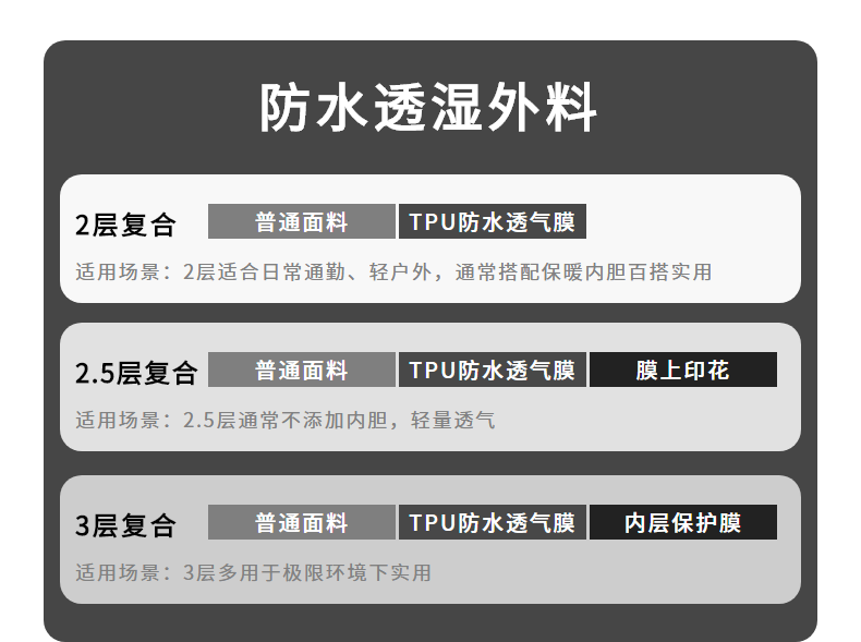 采用科技双层复合压膜面料,面料强度高,质地耐磨,不惧风沙颗粒及户外树枝的刮划。内里防水透气的薄膜,可以阻挡风霜雨雪侵袭。还经过多次防油检验测试,杜绝油污附着、雨雪溅射,水珠、油渍、无法渗透面料,自清洁好打理。