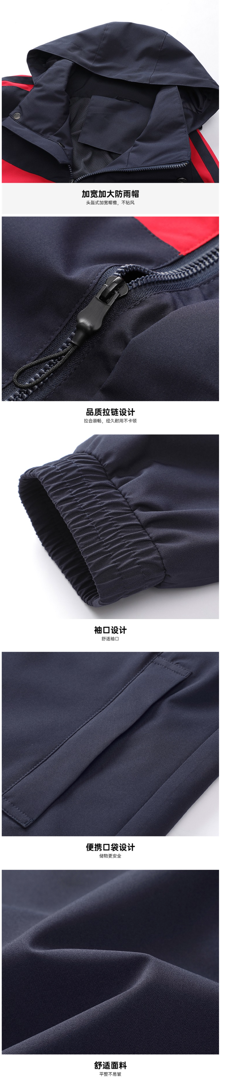 在款式上,合身版型,经典运动风衣款设计,加大加宽的头盔式防风帽,搭配半高领,能很好的防风不漏风,双重门襟,两侧插袋有拉链,置物安全,弹力袖口。