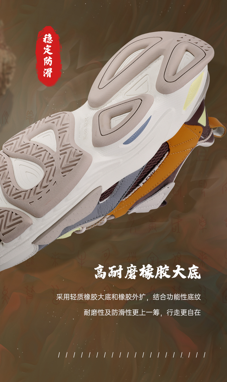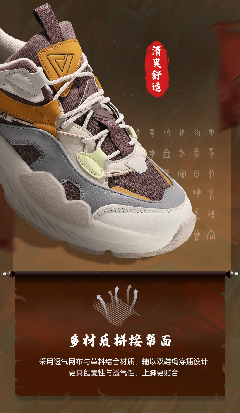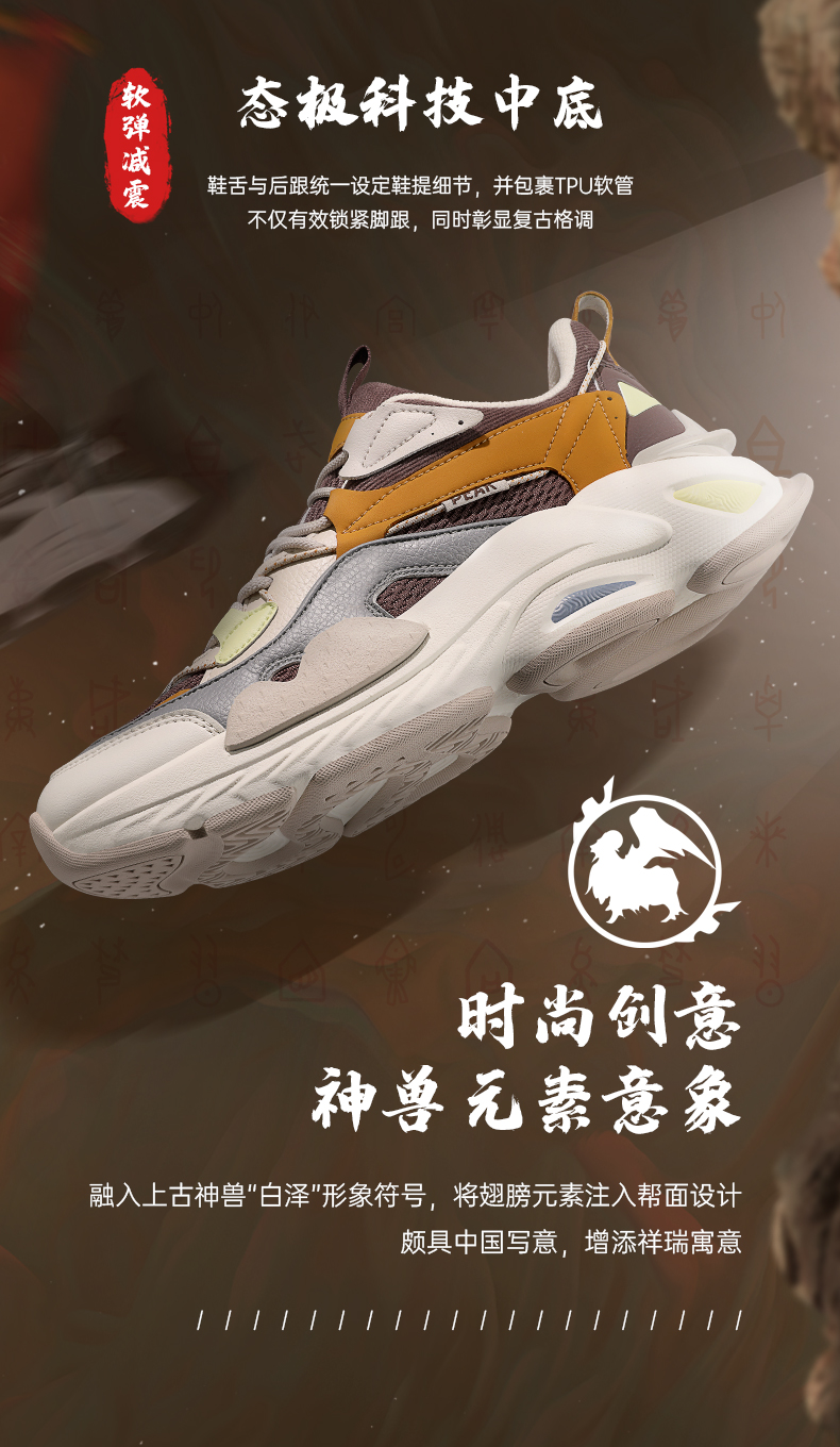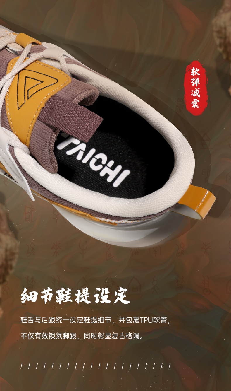 态极“熠熠”以米黄色为主色调,红黄作为点睛之色,鞋头延续至鞋身的国风图案是从中国古建筑“天圆地方”中汲取灵感,象征着四方太平,富贵吉祥;后跟精致的穿绳结构,于细节处见不凡。与此同时,这种通过多处圆与方的几何形态语言表达,刷新视觉体验,将中国元素展现的淋漓尽致。