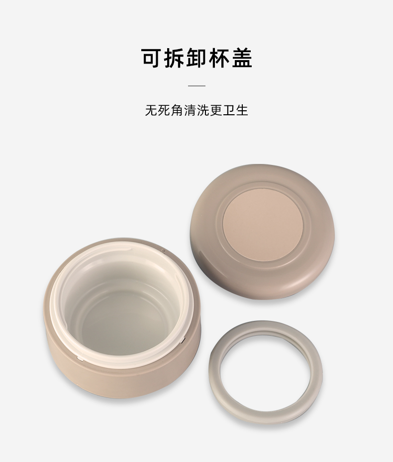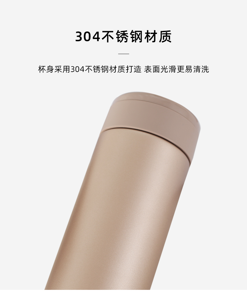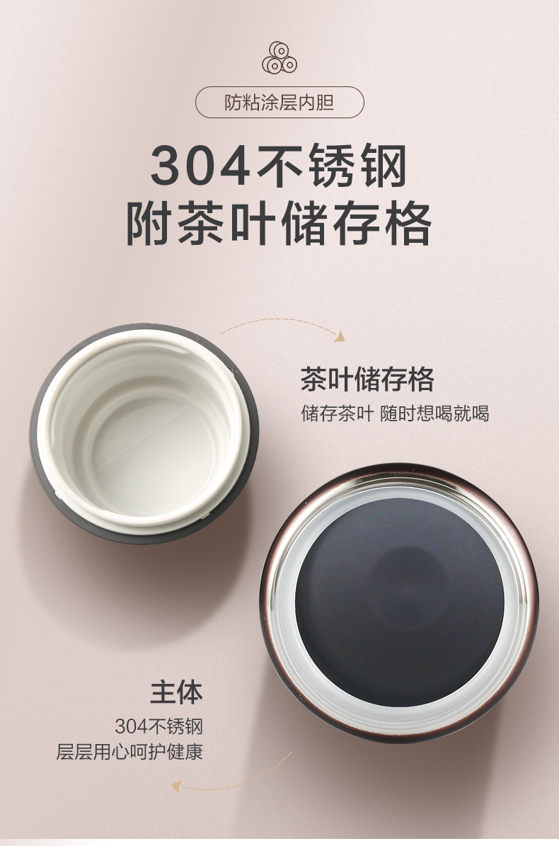 磨砂的杯盖摸上去竟然有点类肤质材质的感觉,手感非常棒,顶盖还自带储物盒,可以储存茶、药片等。杯身使用304不锈钢材质,耐用不生锈不被腐蚀;百万分之一气压高真空断热保温,密封防漏,无论保热还是保冷效果都很好,规格为500ml。
