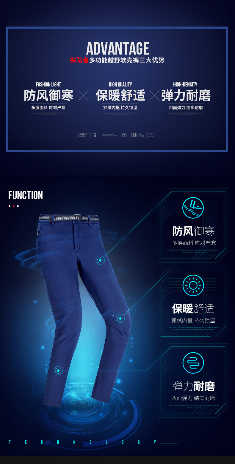 这款探路正适合秋冬季节穿,主身是310g高弹涤纶复合科技面料,使用涤纶纤维制成的双层组织平纹面料,耐磨不易勾丝,韧性强防撕裂;还专门为户外运动考虑,在膝盖处做了专门的耐磨加固可拉伸设计,方便户外运动,做了拉毛处理,减少户外运动时面料与皮肤之间摩擦造成阻力;