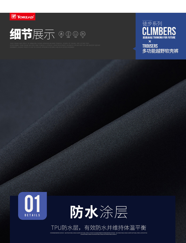 外层的涤纶面料防风、透气、耐磨,正面加了TPU防水涂层,保证小雨环境下不会被浸湿;除此之外,还有10%高弹氨纶,使面料具有360°四维弹力,保证在户外运动时动作自如;内里是100D/144F超细摇粒绒,可直接接触皮肤,柔软蓬松舒适,吸湿排汗保暖速干。
