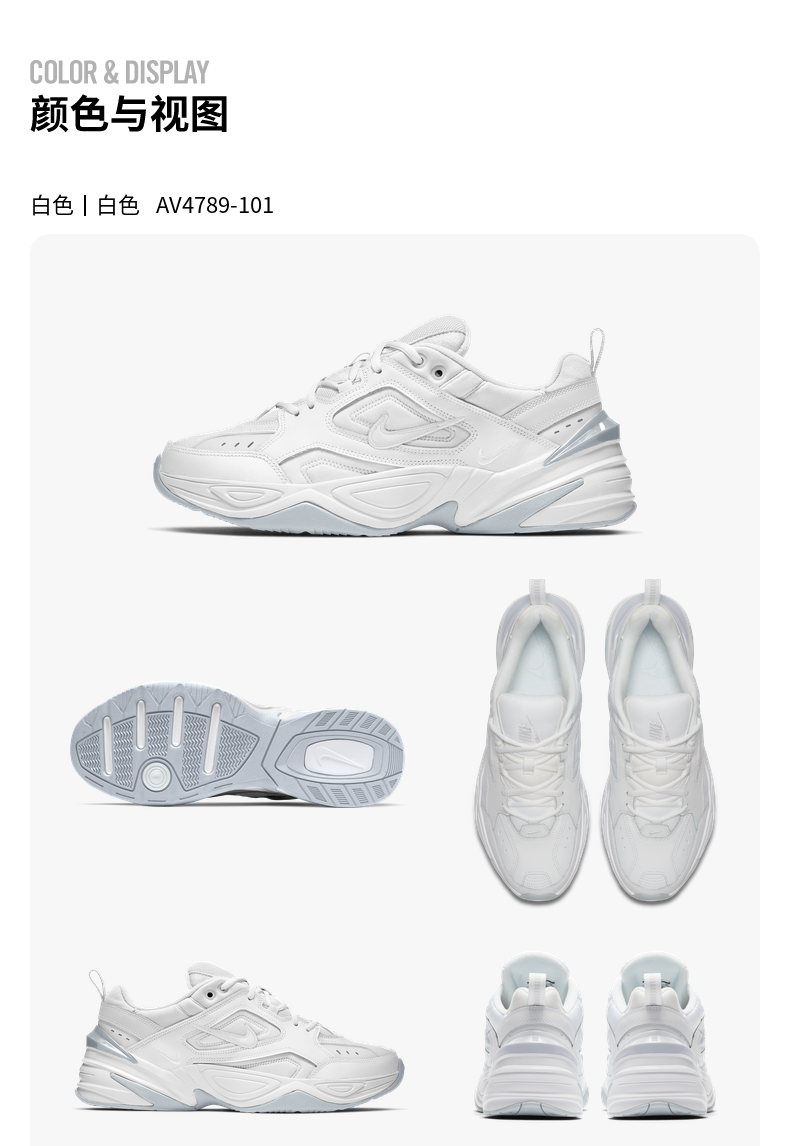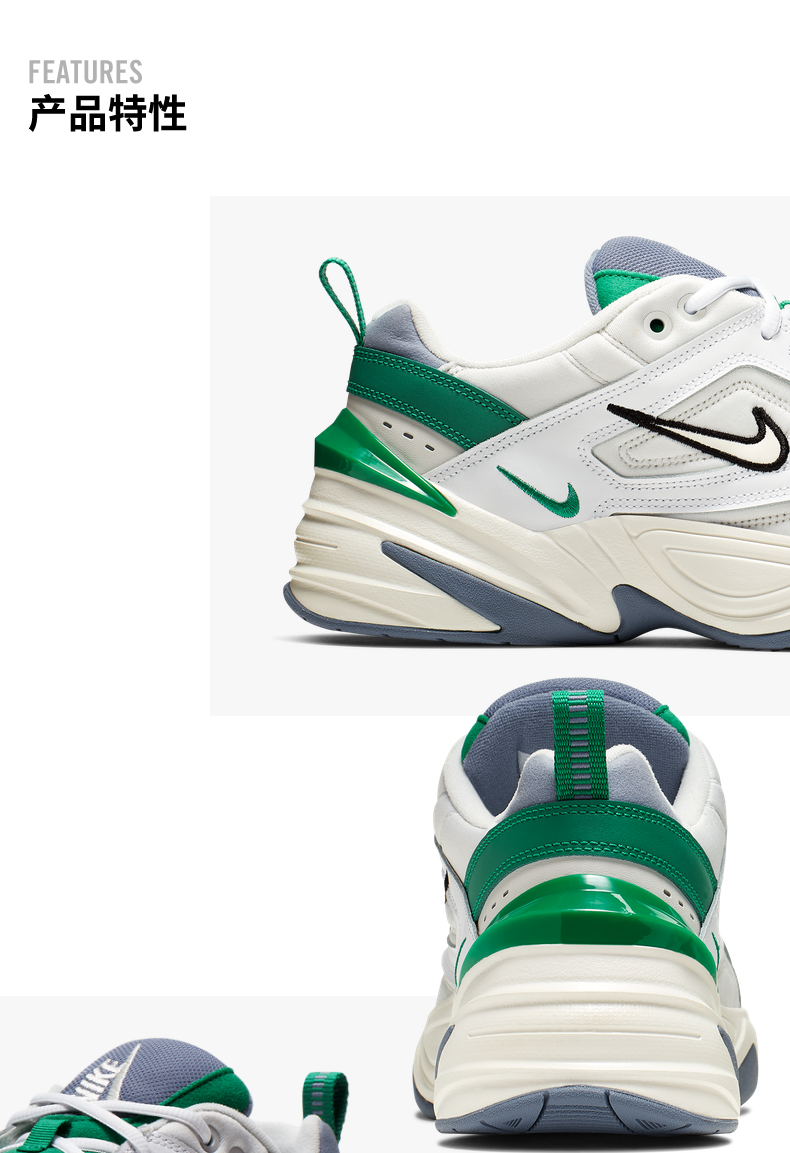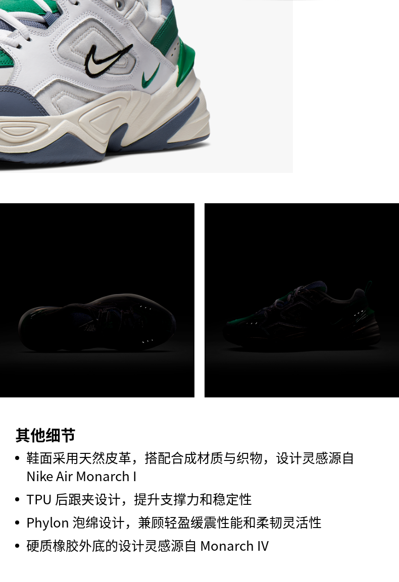 舒适支撑,Nike M2K Tekno男子运动鞋从Monarch经典系列汲取灵感,采用皮革、合成材质及织物组合设计,塑就分层外观。皮革、合成材质及织物组合鞋面,设计灵感源自传统Nike Air Monarch 1,TPU后跟夹设计,提升支撑力和稳定性,Phylon泡棉设计,兼顾轻盈缓震性能和柔韧灵活性,橡胶外底的设计灵感源自Monarch IV。