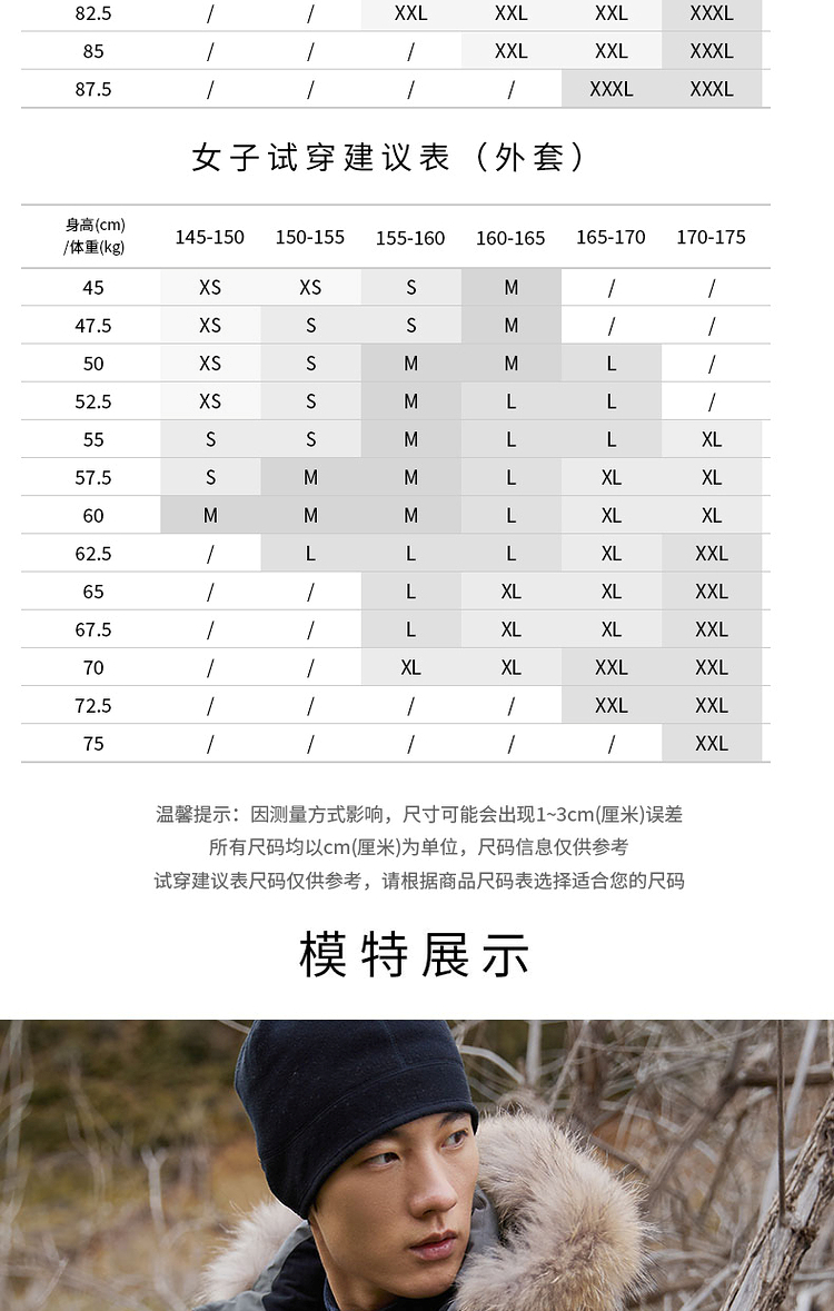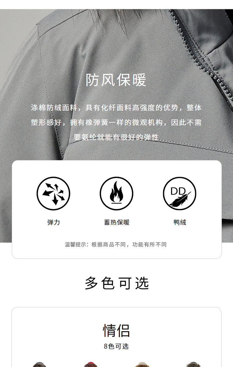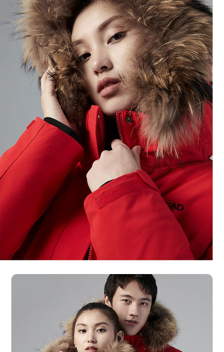 羽绒服核心的羽绒和充绒量方面,填充了90%的鸭绒,男女款XL码的充绒量都达到了200g以上,是中厚款羽绒服,适合-20℃以上的环境穿着。
