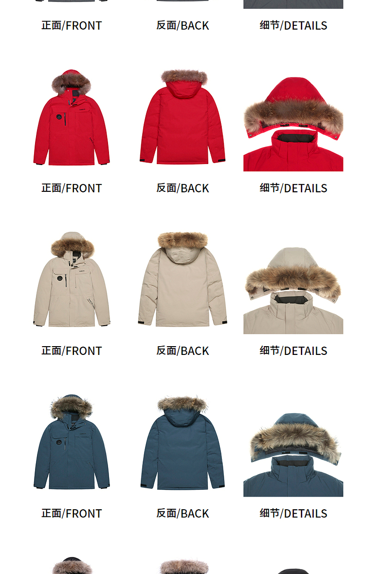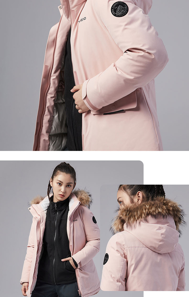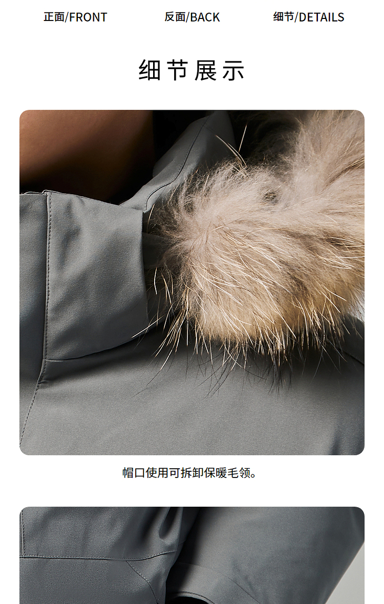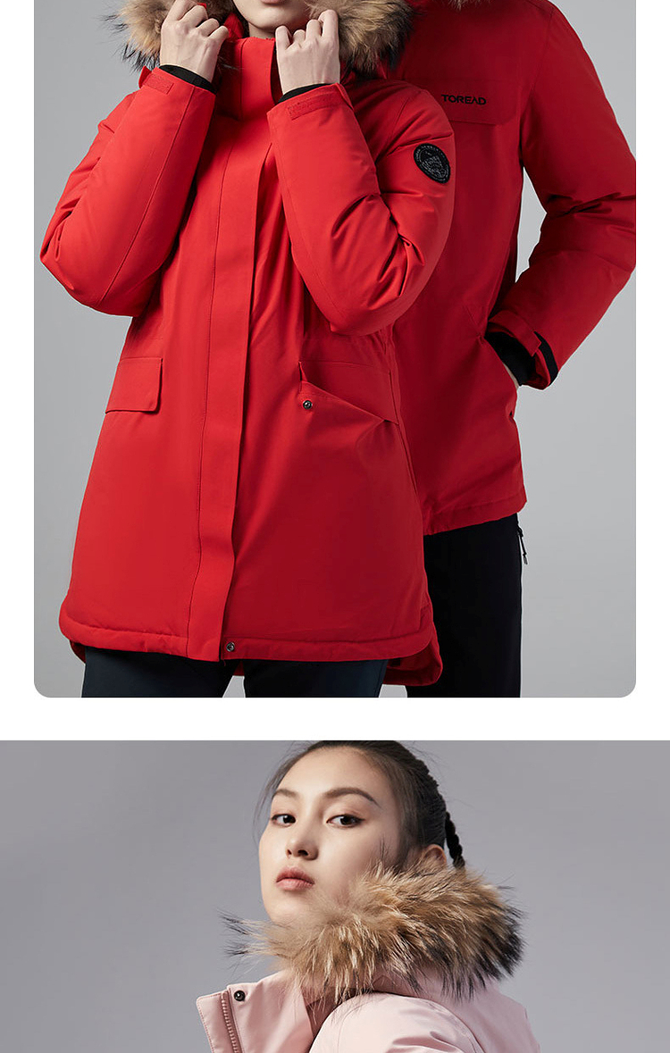 羽绒服外层使用了棉涤仿绒面料,防风保暖,防泼水,具有化纤面料高强度的优势,整体塑形感好,同时具有一定的弹性,穿着不束缚;内里双层羽绒胆布,不易钻绒,耐穿好打理;帽毛位置为真貉子毛领,柔软舒适,保暖性好,有效防止寒风扎脸。