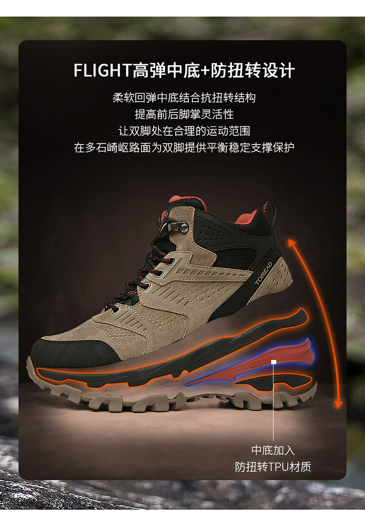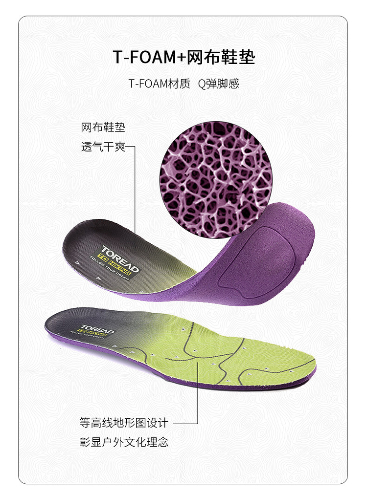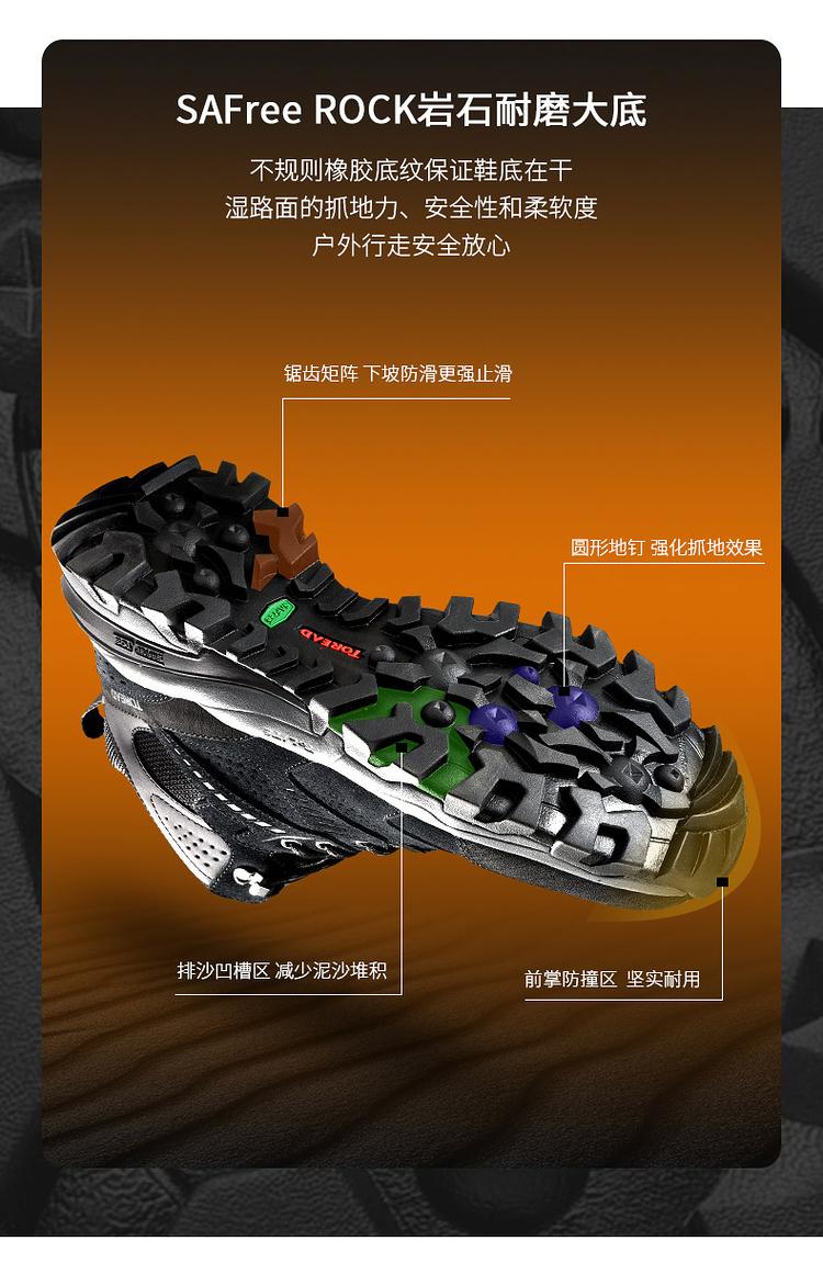 T-FORM防菌透气鞋垫,抗菌除臭,耐压缩,有效避免鞋垫出现塌陷现象;一体式T-PACK后跟保护结构,行进过程中更稳定,不易崴脚;中底是Flight弹力中底科技搭配抗扭转结构,提高前后掌的灵活性,在崎岖多石的路面上给与更好的保护;Safree Rock岩石耐磨大底,加上圆形地钉,抓地力非常强,使是湿滑路面也能稳步前行。