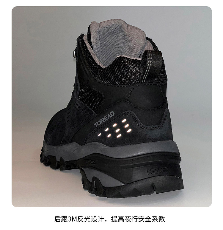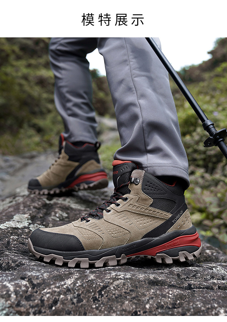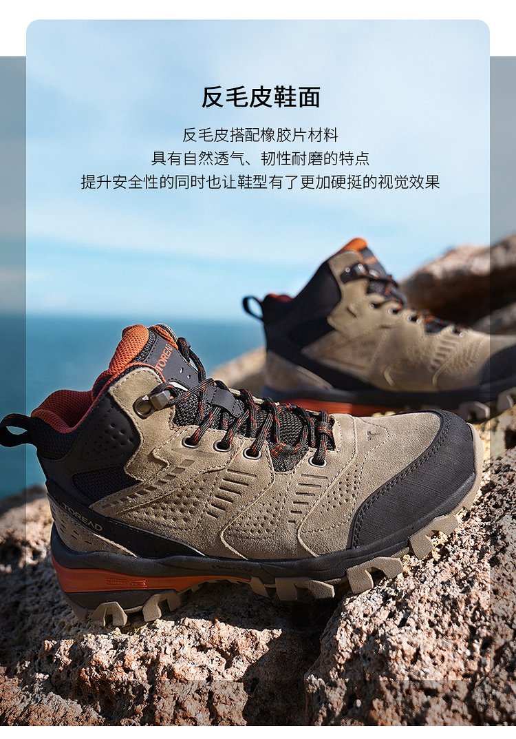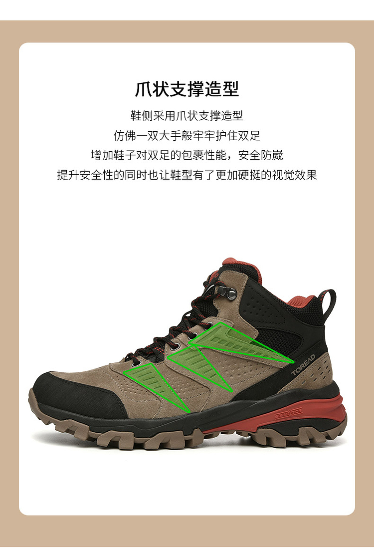 这款登山鞋的鞋面是反毛皮搭配橡胶插片的设计,高强度、抗撕裂,兼顾透气、包裹和耐磨,不会对脚部造成太大的负担;侧面经典的爪型线条结构,可牢固的锁住鞋型,增强鞋子对双脚的包裹,安全防崴脚,提升安全性。