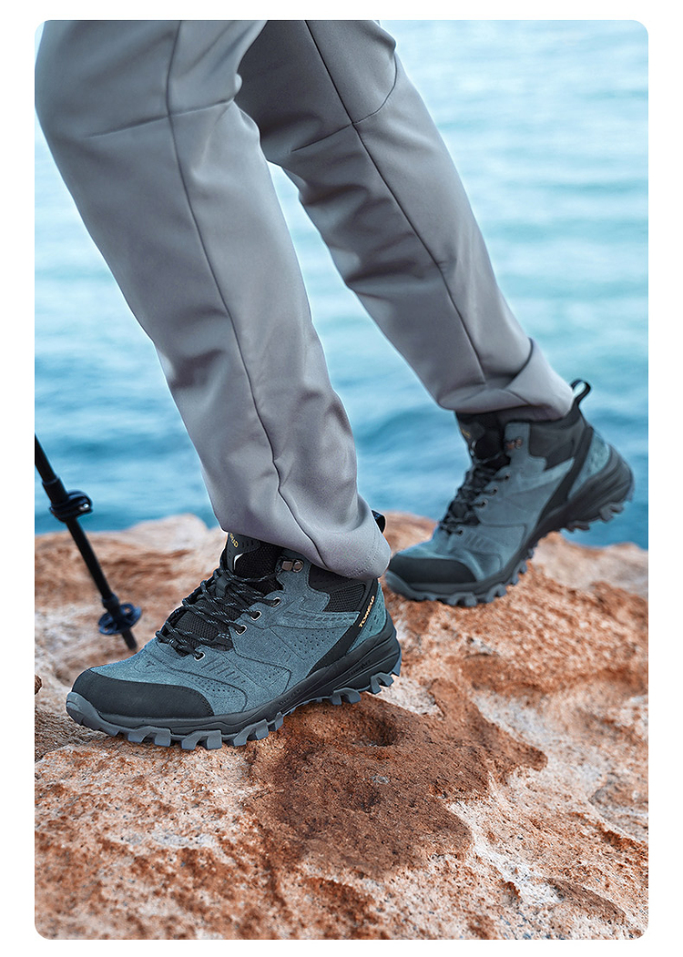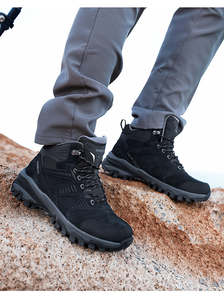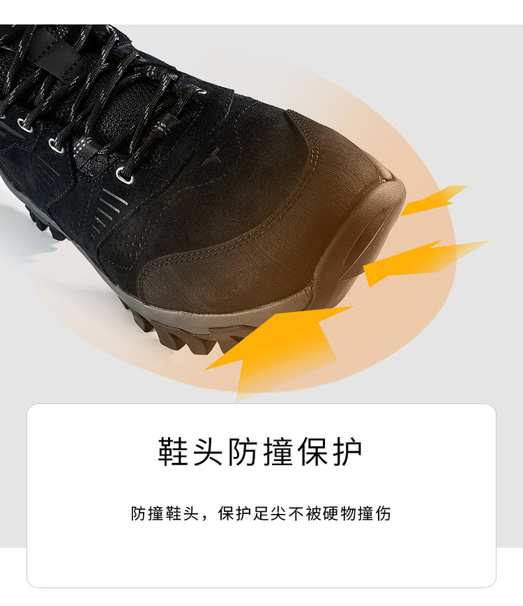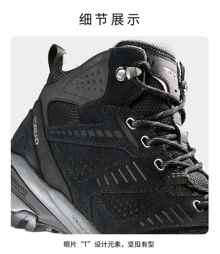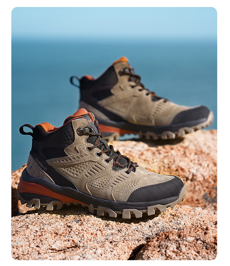这款登山鞋的鞋面是反毛皮搭配橡胶插片的设计,高强度、抗撕裂,兼顾透气、包裹和耐磨,不会对脚部造成太大的负担;侧面经典的爪型线条结构,可牢固的锁住鞋型,增强鞋子对双脚的包裹,安全防崴脚,提升安全性。
