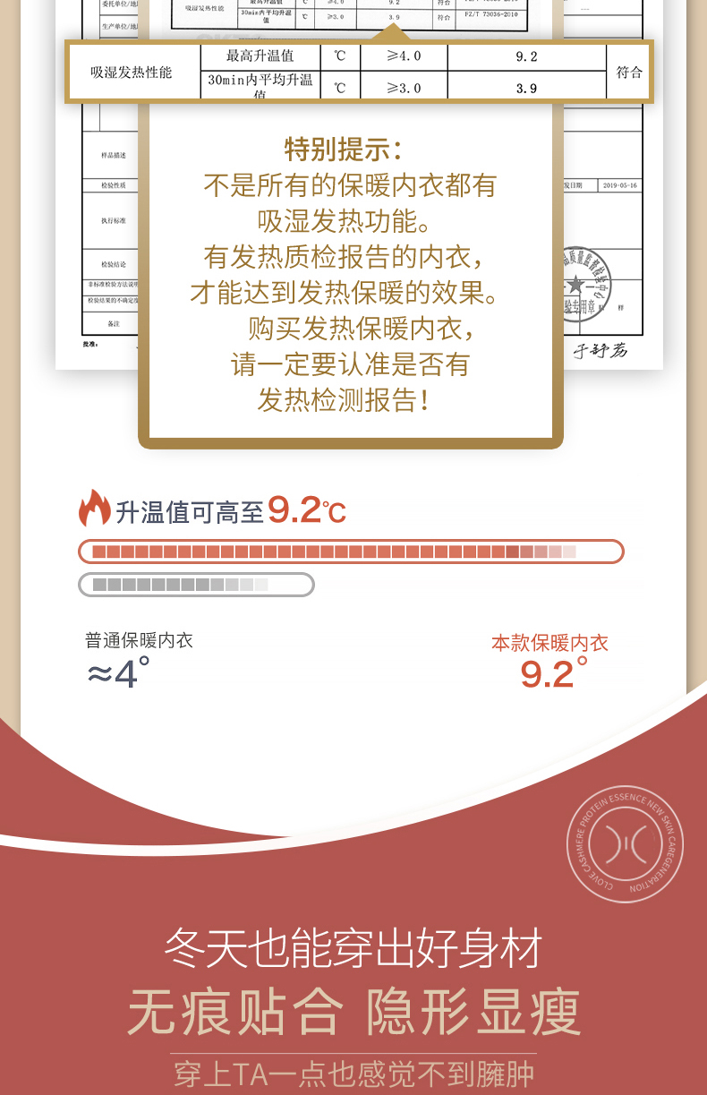 这款保暖内衣,面料材质成分: 粘胶纤维(粘纤)48.8% 聚丙烯腈纤维(腈纶)22.5% 棉20.3% 聚氨酯弹性纤维(氨纶)8.4%四种纤维混纺,面料有着比棉更柔软的触感,且吸湿性好,穿着透气舒适,不易起皱,双面磨绒处理贴身穿着保暖更舒适;