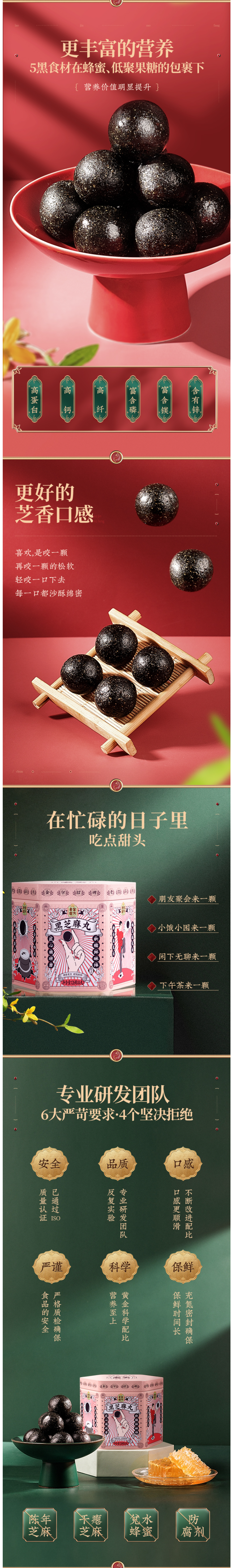 选用当季黑芝麻,颗粒饱满,干净无杂质,香脆美味,清洗后高温烤制需要把握精准的火候;用蜂蜜代替糖调制蜜丸,口感稍甜却不腻,蜂蜜清润细腻,不粘牙。单颗独立包装,充氮保鲜。