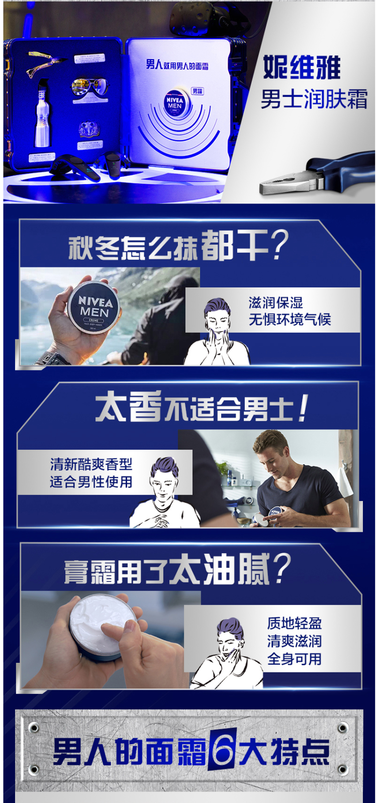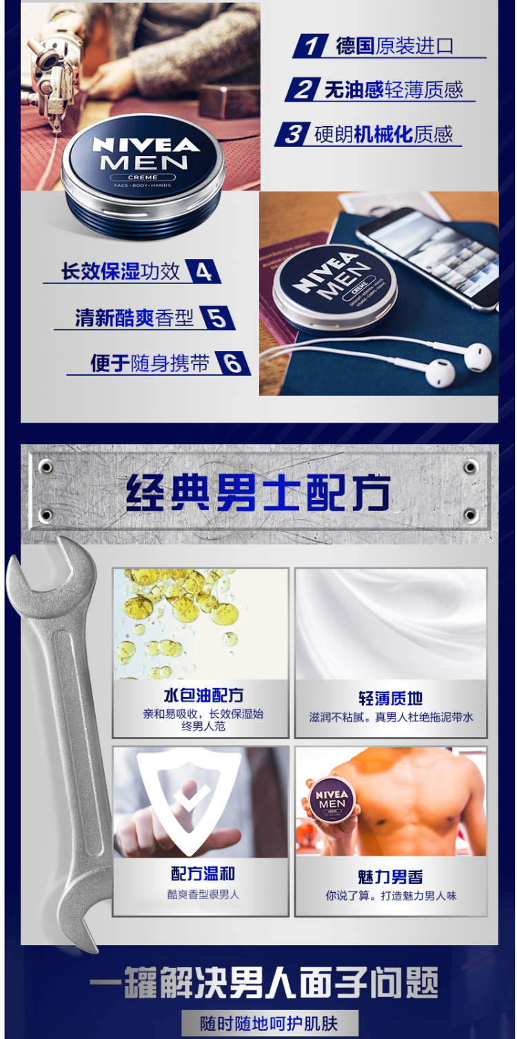 编辑之前喜欢买大容量的,自从有次坐飞机被没收之后就开始买100ml及以下的了,方便携带。这款妮维雅 男士保湿补水面霜,专为秋冬季研制,乳白色质地,含有水包油配方,亲和吸收,长效补水保湿,清爽无油腻,防止脸部干燥、冻伤、粗糙等问题,持久滋润保湿,补水抗干,规格75g。