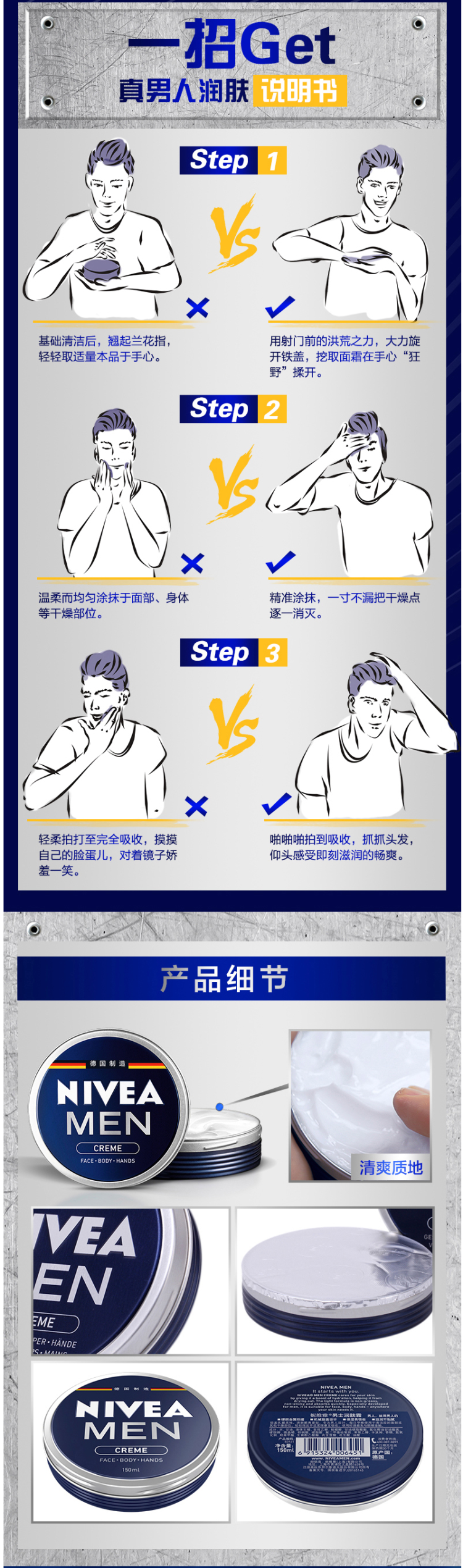 这款妮维雅 男士保湿补水面霜,俗称“男罐”,是一个比较便宜的大碗的产品,质地柔软比较容易化开,早上洁面后抹一次,能滋润一整天!