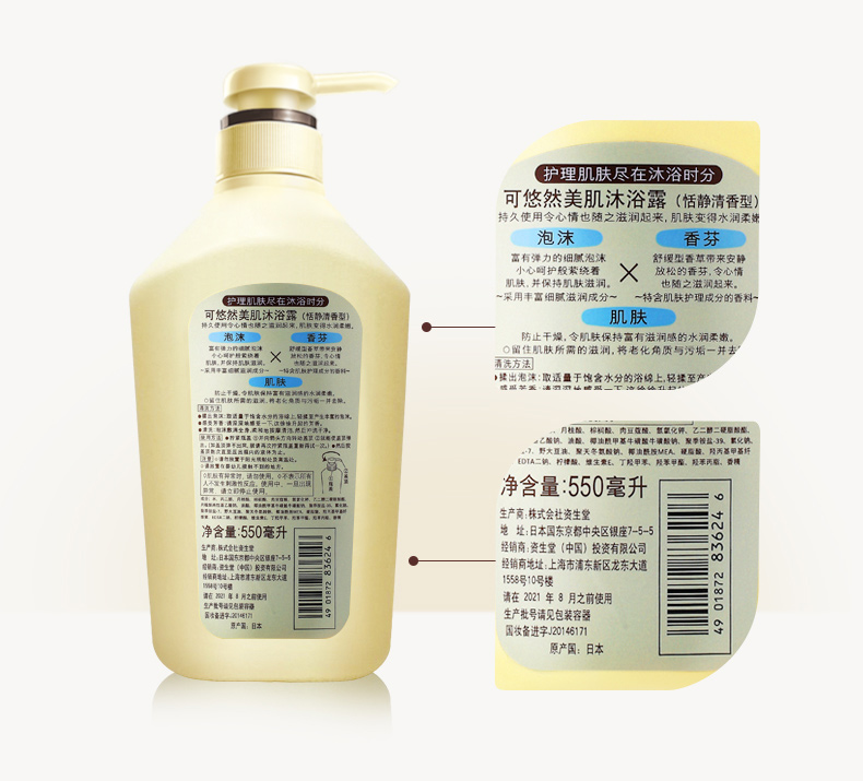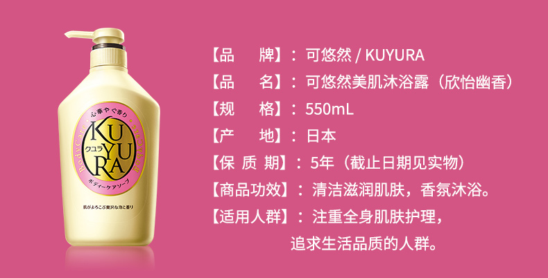 这款可悠然美肌沐浴露,日本原装进口,富含肌肤所需矿物质,以及具有快速渗透力的植物精华,内含保湿因子,随时随地快速地为肌肤补充营养水分。