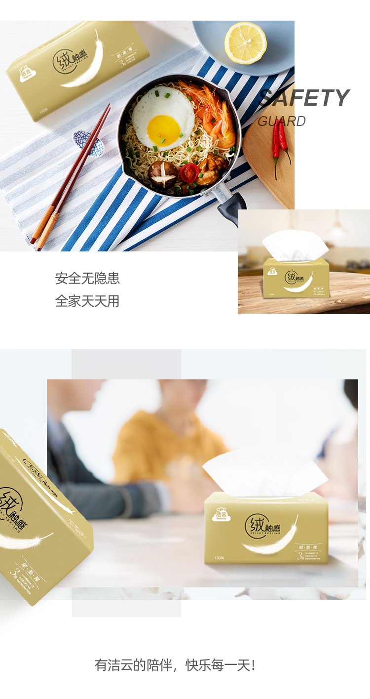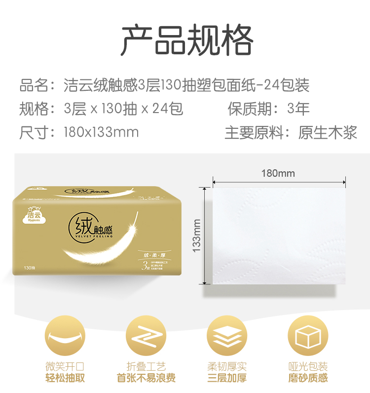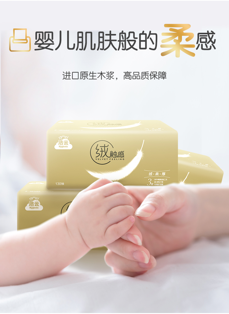 采用进口原生木浆制作,3层130抽,主打绒触感,柔软厚实,不掉纸屑,笑脸开口、哑光包装精美。