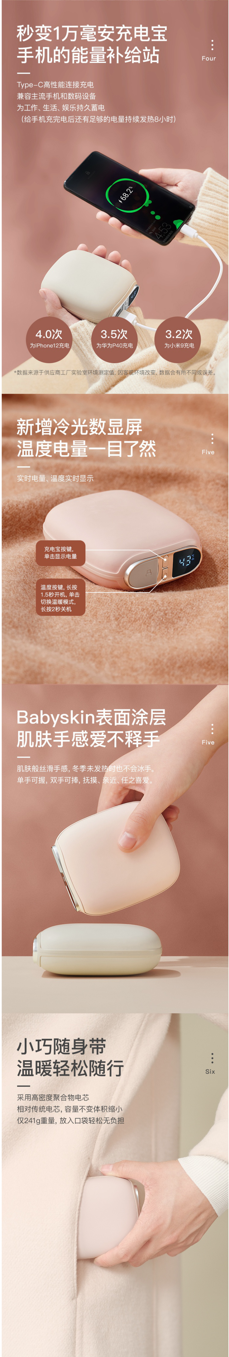 当它是充电宝时:10000mAh大容量、Type-C充电,它采用高密度聚合物电芯,相对传统电芯,容量不变体积缩小,仅241g重量,放入口袋轻松无负担,小巧随身帯,温暖轻松随行。