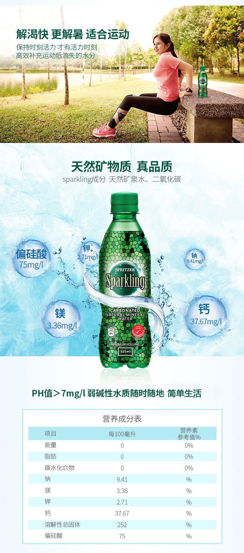 spritzer的水源地是来自马来西亚热带原始雨林。雨林生态保存完好,泉水是天然矿物质弱碱性水,据说是两亿年无人踏足的地方,水质天然纯净,远离工业污染。富含水溶性偏硅酸,可以直接被身体吸收利用,每100毫升 含偏硅酸 75,钙 37.67、镁 3.36,钾 2.71、钠 9.41,规格: 325ml*24瓶。