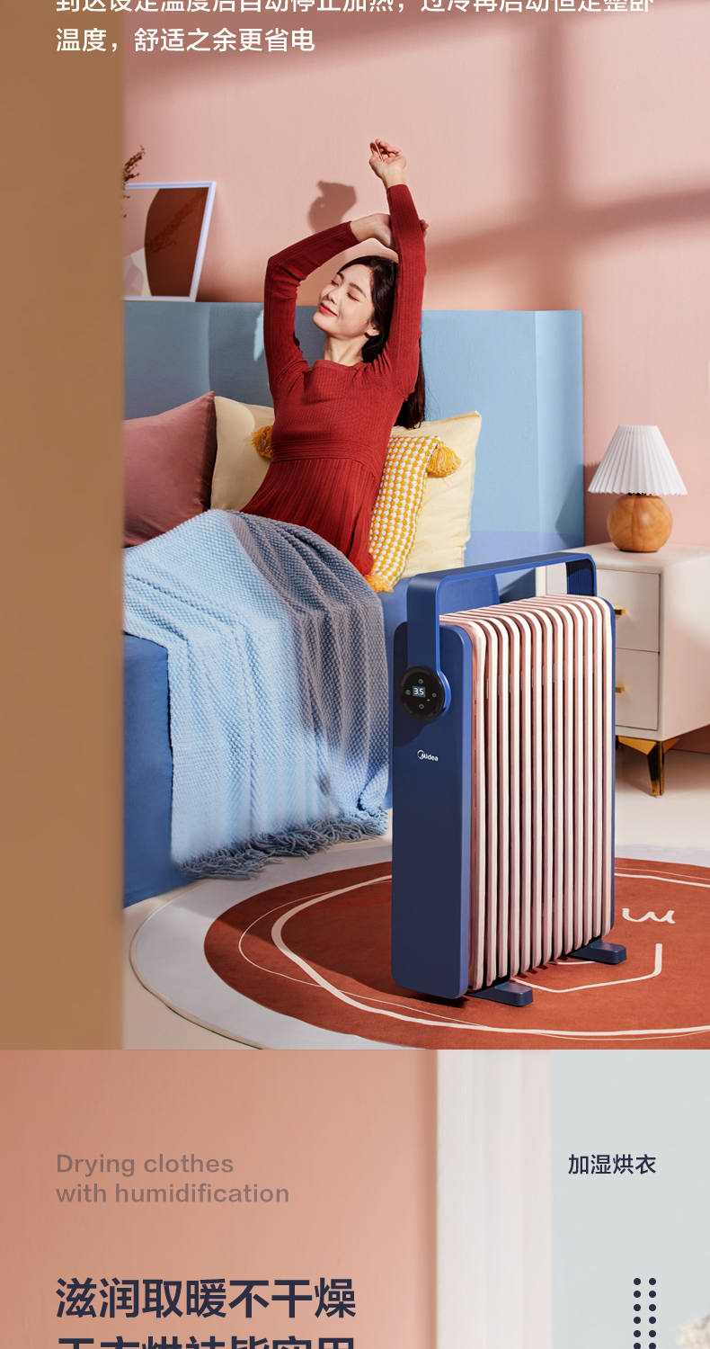 配有蒸发式水盒,滋润取暖,舒适不干燥,配有折叠式干衣架,可烘衣服、毛巾、袜子等。底部隐藏式滑轮,灵活移动不费力。