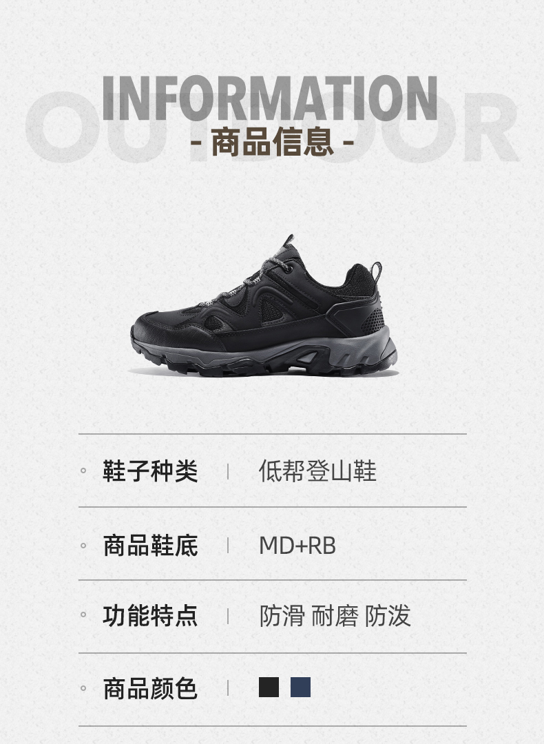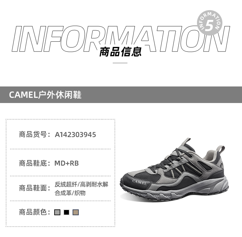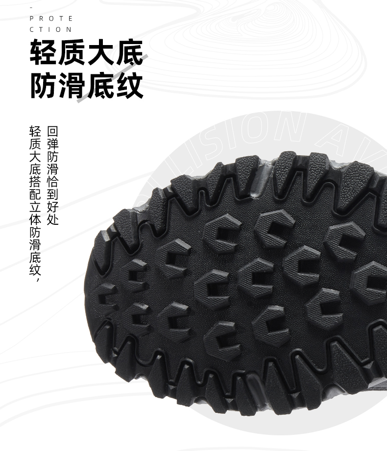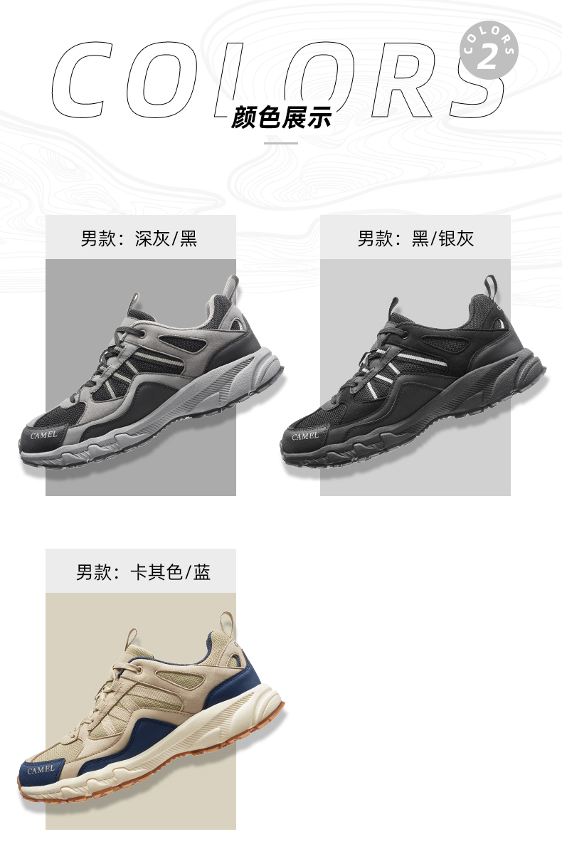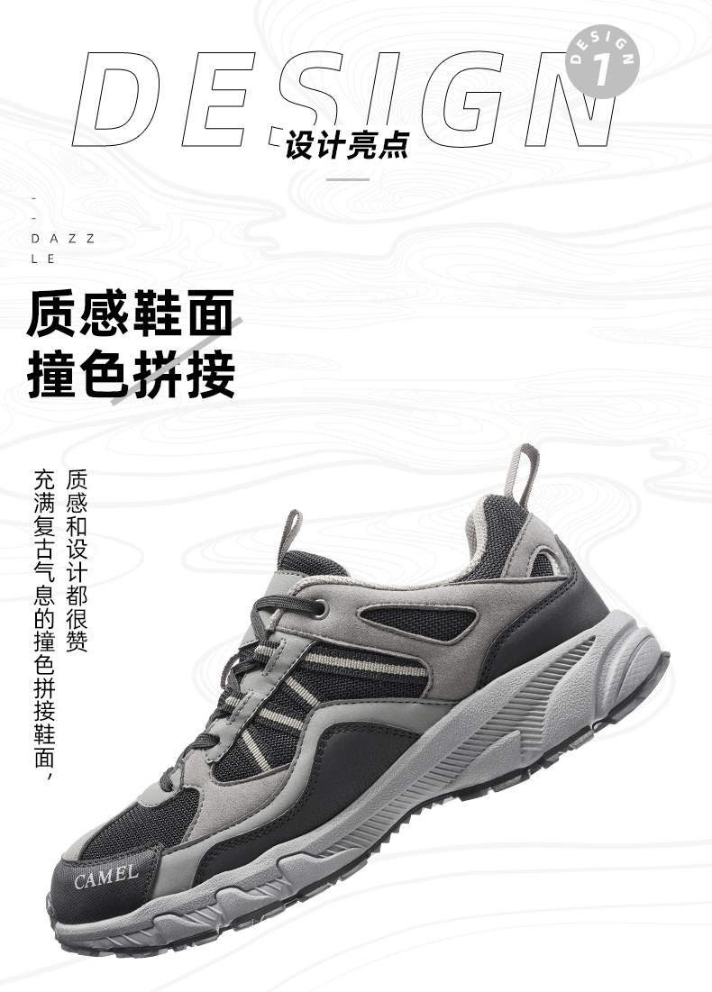 鞋面采用返绒超纤、高剥耐水解合成革、织物等材质,复古撞色拼接,充满质感,舒适包裹,防护力与透气并存,结合透气软弹鞋垫,久穿干爽不闷热。轻质防滑大底搭配立体底纹,具有优秀的抓地力,防滑耐磨为徒步旅行。登山提供安全保障,