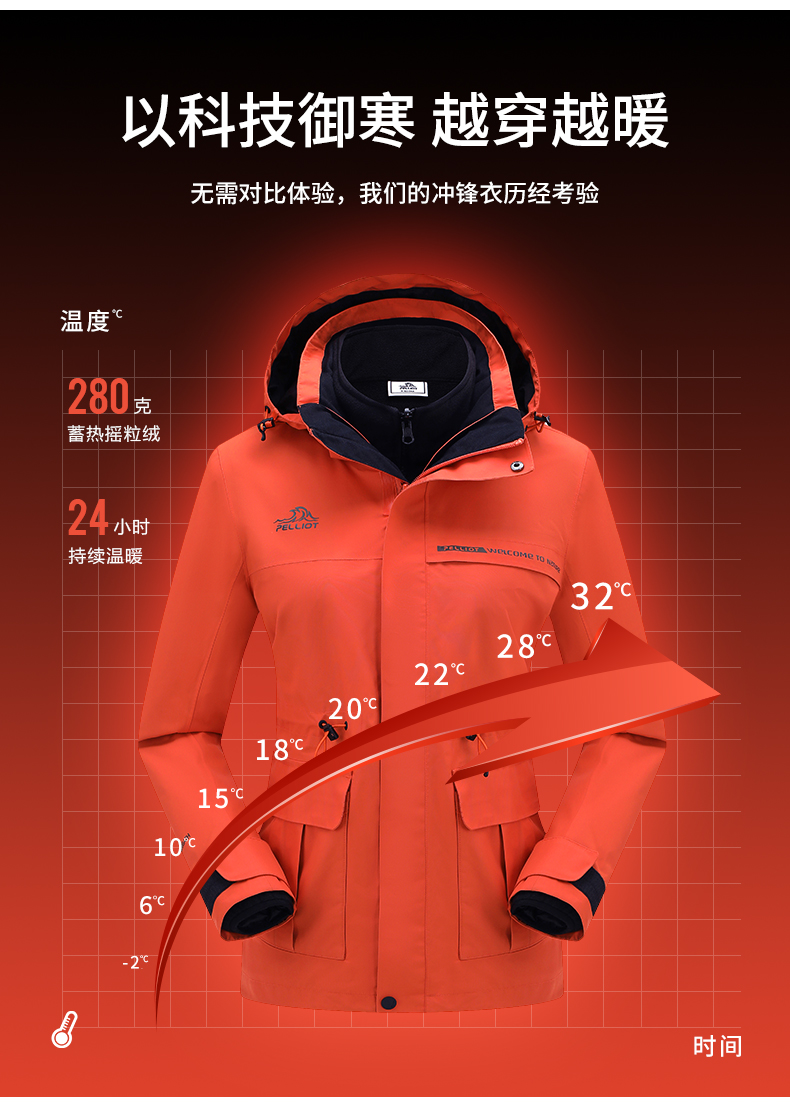 内胆采用280高克重摇粒绒衣,双刷双摇工艺,绒粒蓬松柔软,蓄热保暖,科技御寒,可与冲锋衣外套组合穿着,也可好天气时分别单穿,多种不同穿搭,适合应对多种场景。