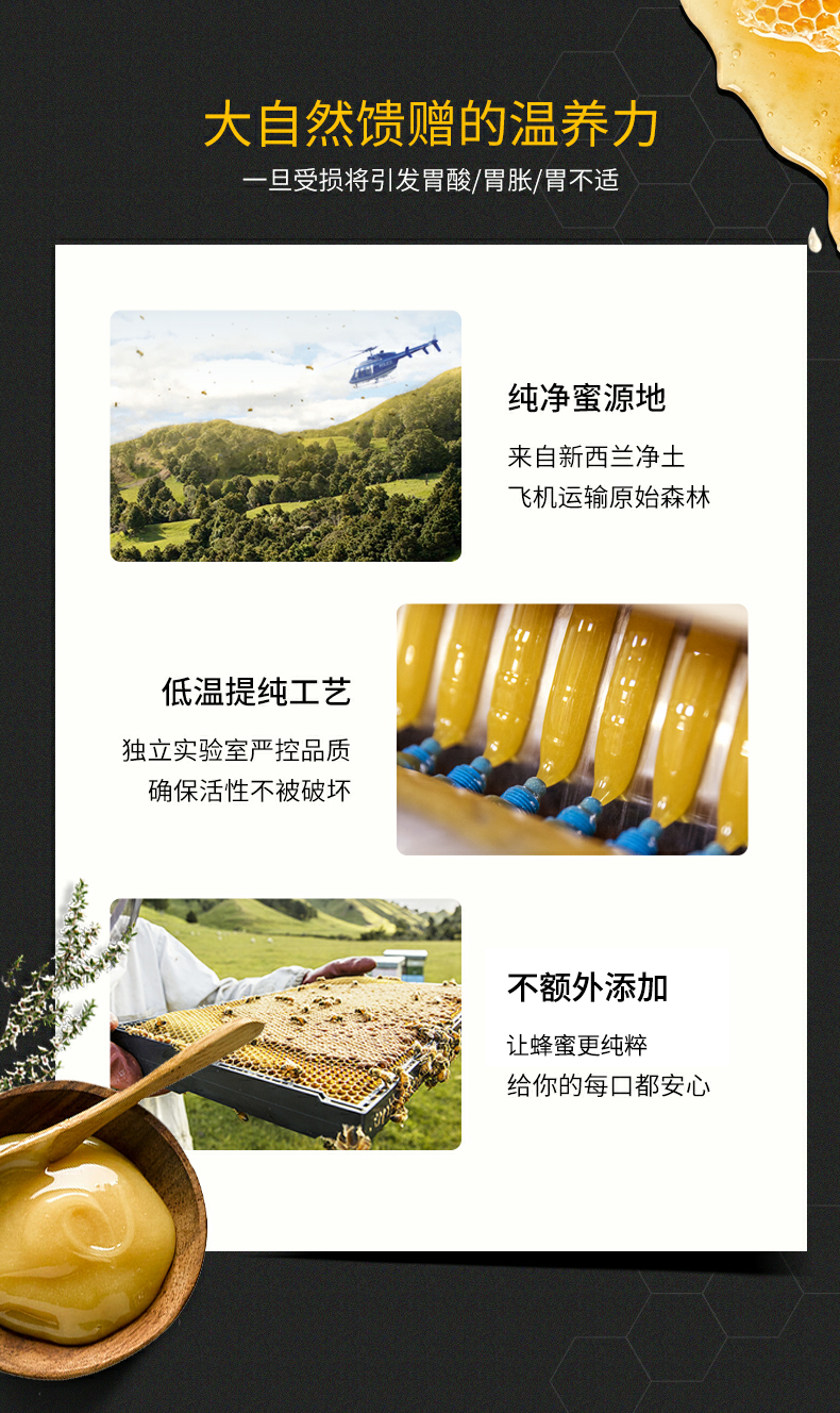其强大的治疗功效在新西兰和澳洲均已得到广泛的临床证实,在美国更是蜂蜜中唯一准入药品市场的添加成分麦卢卡蜂蜜中,含有一种抗菌因子-麦卢卡因子,有良好的抗氧化能力,可以促进伤口自然愈合,尤其在对调养诸如慢性胃炎、幽门螺杆菌、胃溃疡等胃肠道疾病上效果非常好。