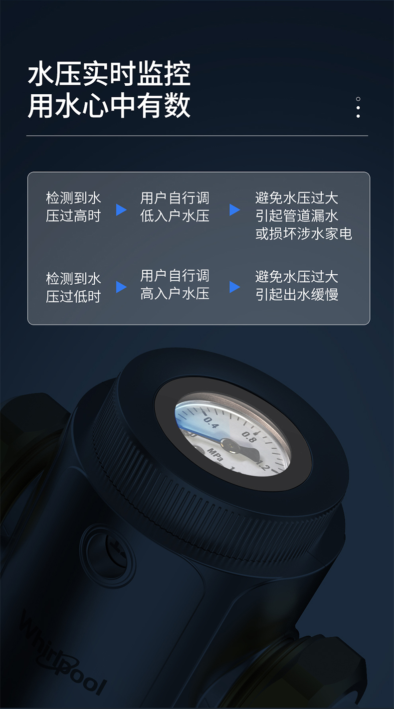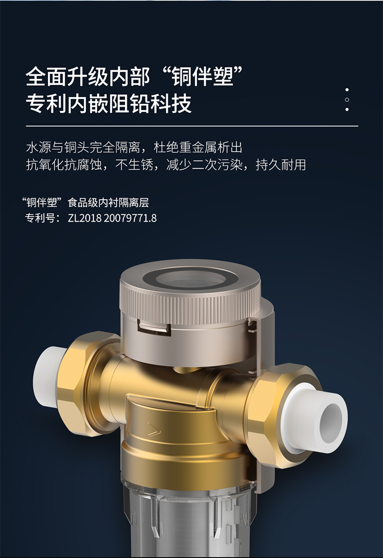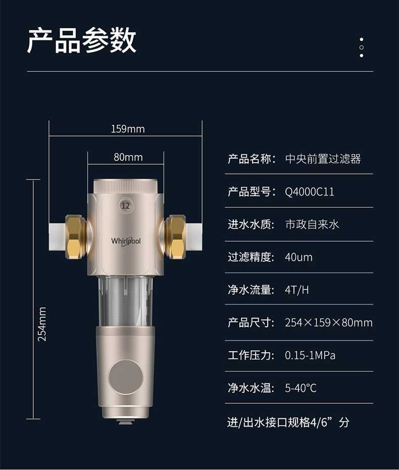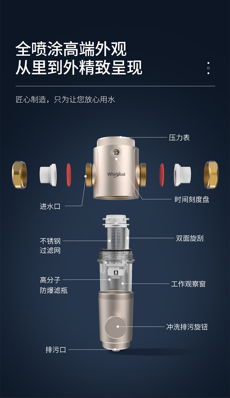 这款惠而浦 家用前置过滤器,4T大通量,出水快速无需等待,专利阻铅工艺+食品级材质,用水安全,杜绝二次污染。