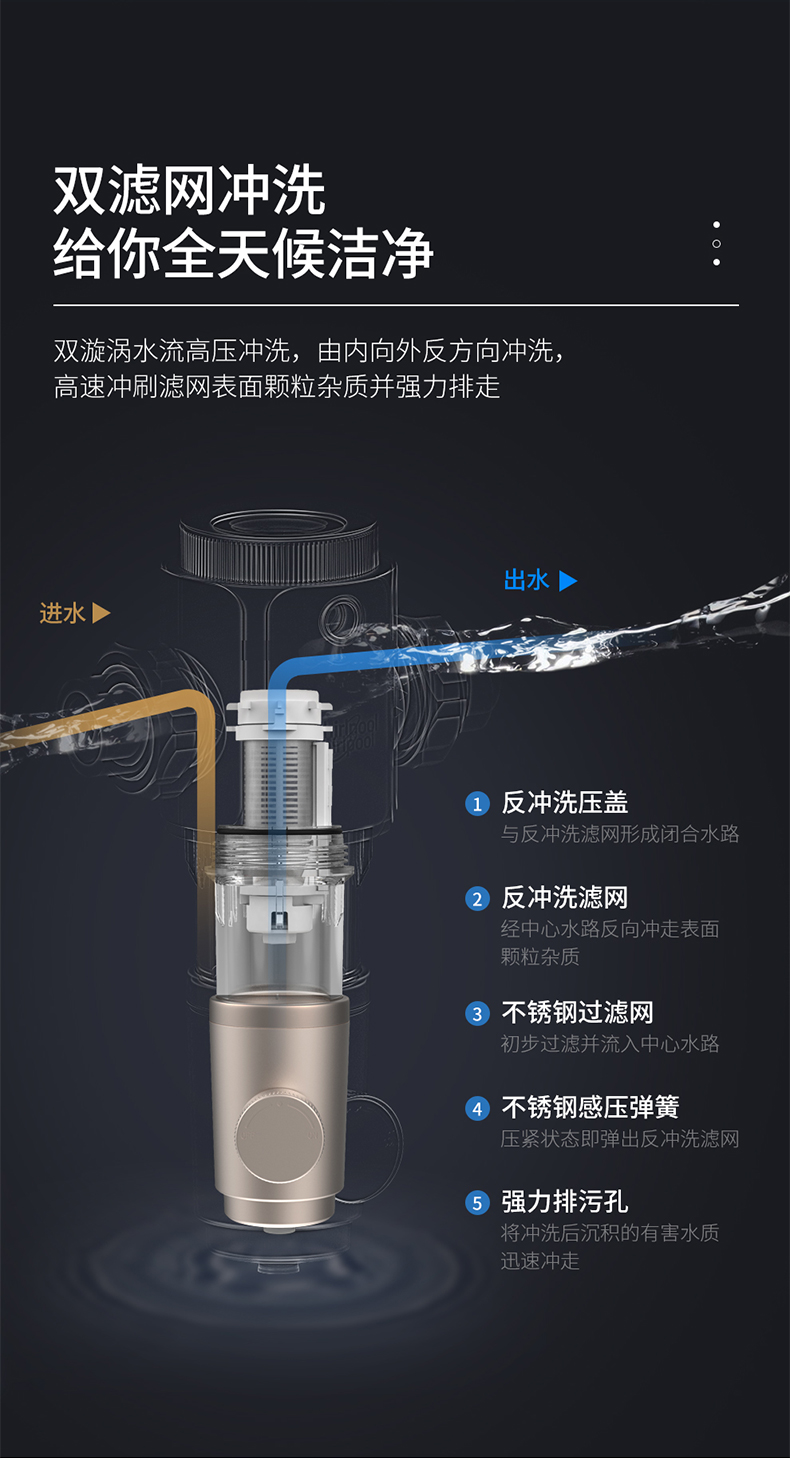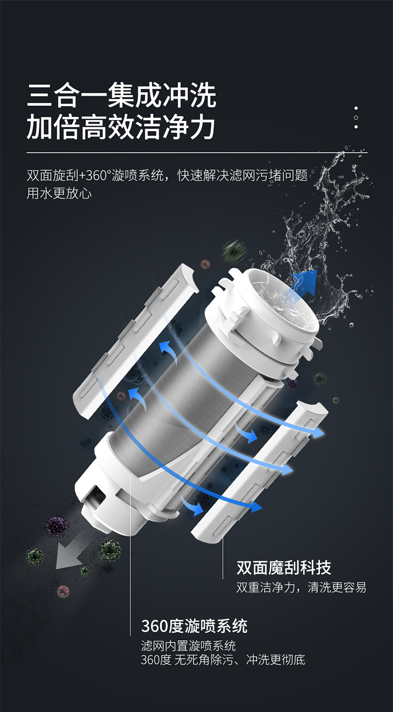 采用316医用级不锈钢滤网,耐酸耐碱耐腐蚀,40微米高过滤精度,可过滤水中的泥沙、铁锈、悬浮物等大颗粒杂质,为居家用水设备提供保护,延长电器使用寿命;360度漩涡水流高压喷洗系统+双面摩刮,可快速解决滤网污染堵塞问题,强力排污,用水更放心;