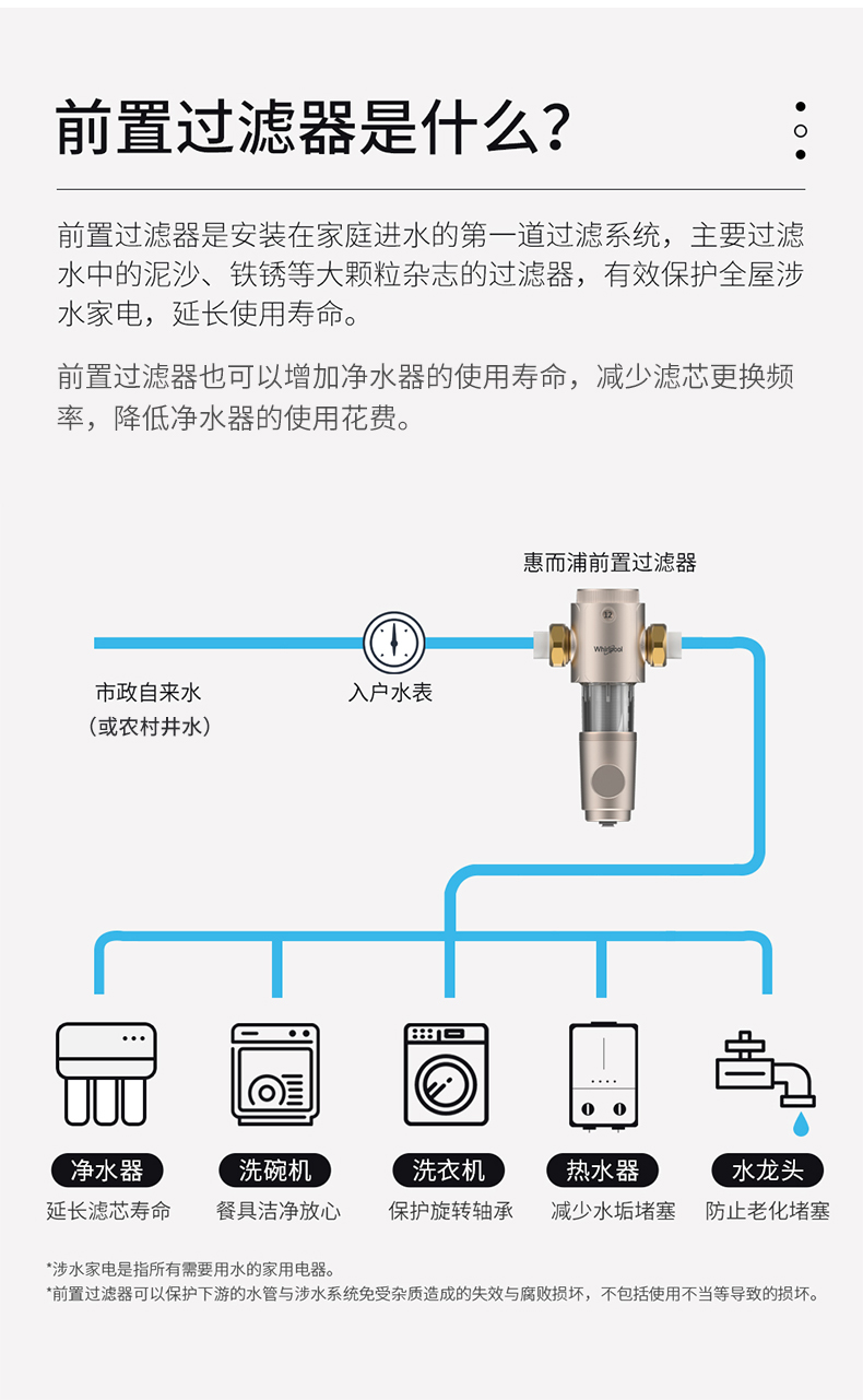 安装前置过滤器可过滤水中的泥沙、铁锈、悬浮物等大颗粒杂质,为居家用水提供保护。可保护水阀、龙头、花洒、热水器、洗衣机、净水器滤芯等家电的寿命。而且前置过滤器的滤网可反复冲洗使用,一次投入收益很大。
