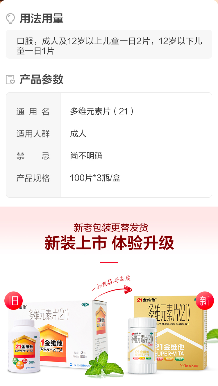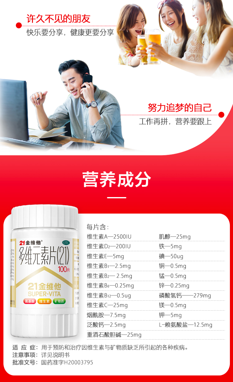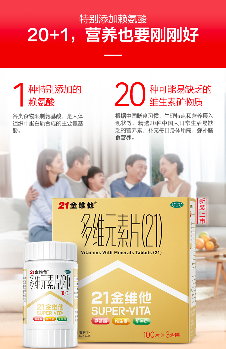 维生素和矿物质均为维持机体正常代谢和身体健康必不可少的重要物质,缺乏维生素可导致代谢障碍而引致多种疾病。这款21金维他 多种复合维元素片,包含赖氨酸和20种易缺乏的维生素矿物质,补充每日身体所需,