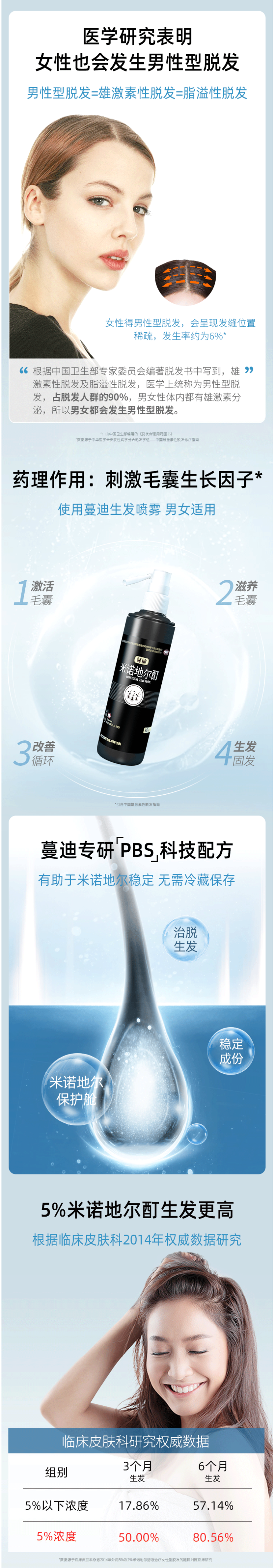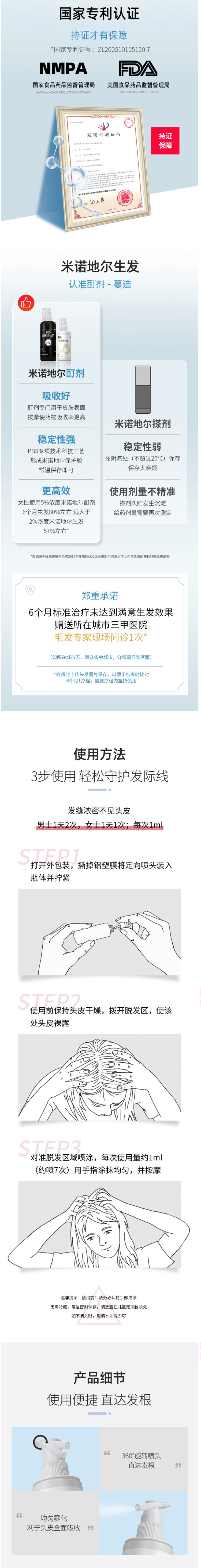 国药准字OTC非处方药,是市面上真实有效的生发药用品,成份为米诺地尔,是一种周围血管舒张药,局部长期使用时,可刺激男性型脱发和斑秃患者的毛发生长。适用于男性雄激素源性脱发、女性雄激素源性脱发、斑秃患者。
