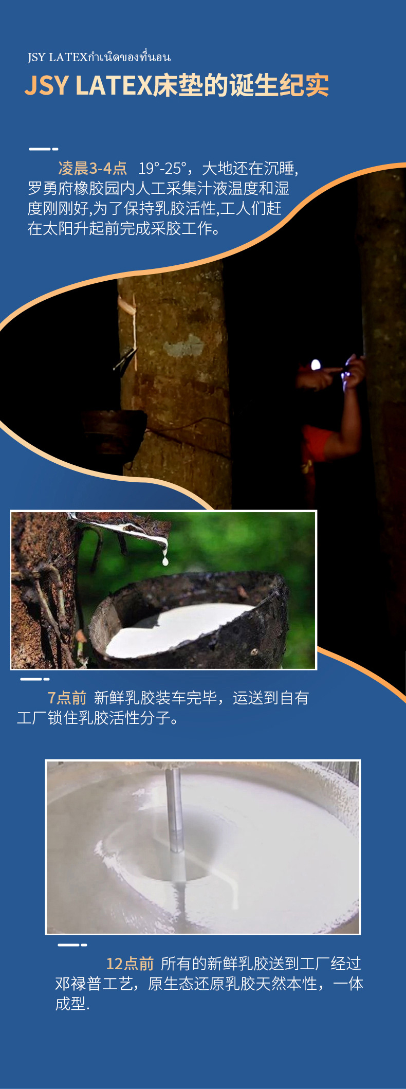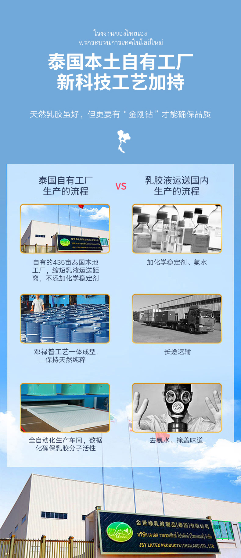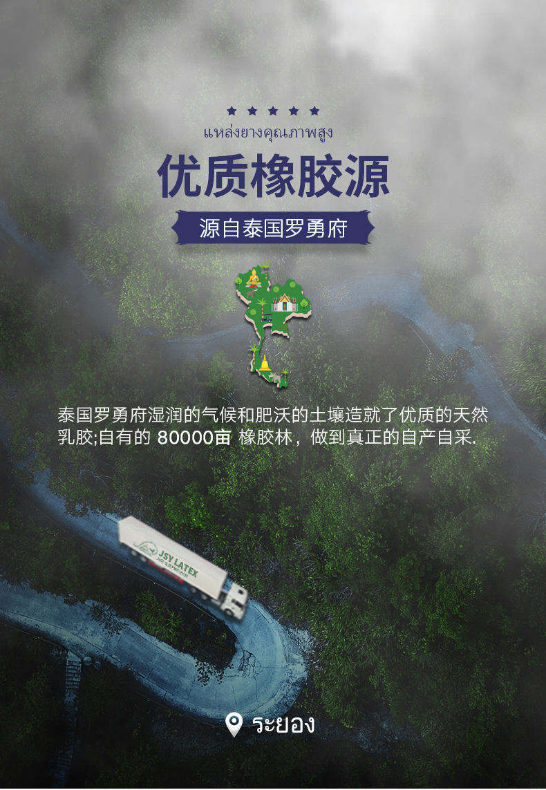 JSY LATEX工厂在泰国罗勇府全球首家专业橡胶基地立盛橡胶基地,致力提供给消费者健康舒适的睡眠体验;所售乳胶产品通过ECO、SGS、TUV、ISPA、CCIC、ISO9001等多项国际权威机构认证,采用工厂直销发货的方式,省去中间商,让利消费者,提供极致性价比的泰国原装进口乳胶产品;