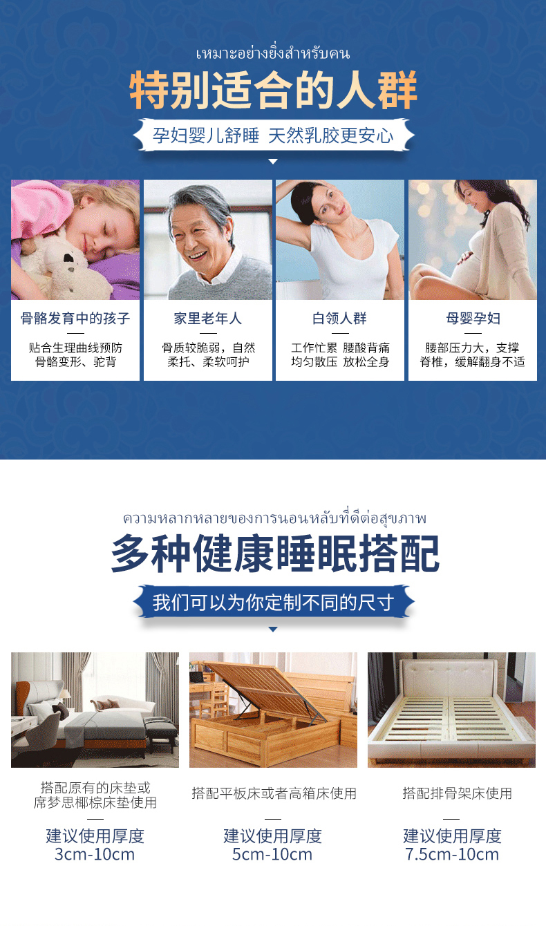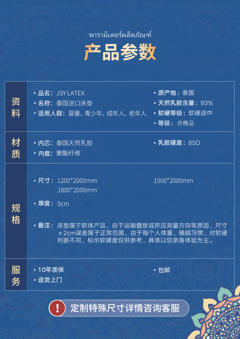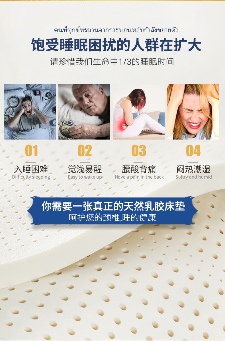 目前也是泰国副总理朱林阁下推荐的乳胶品牌; 这款乳胶床垫采用泰国新鲜乳胶原液生产,清香自然,透气轻盈,邓禄普物理发泡工艺,乳胶含量93%以上,防螨抗菌,贴合身体曲线,舒适承托,能够有效改善睡眠质量;下单即送配套床套+两个乳胶枕头;此款有多个尺寸规格可选,可满足众多人的需求。