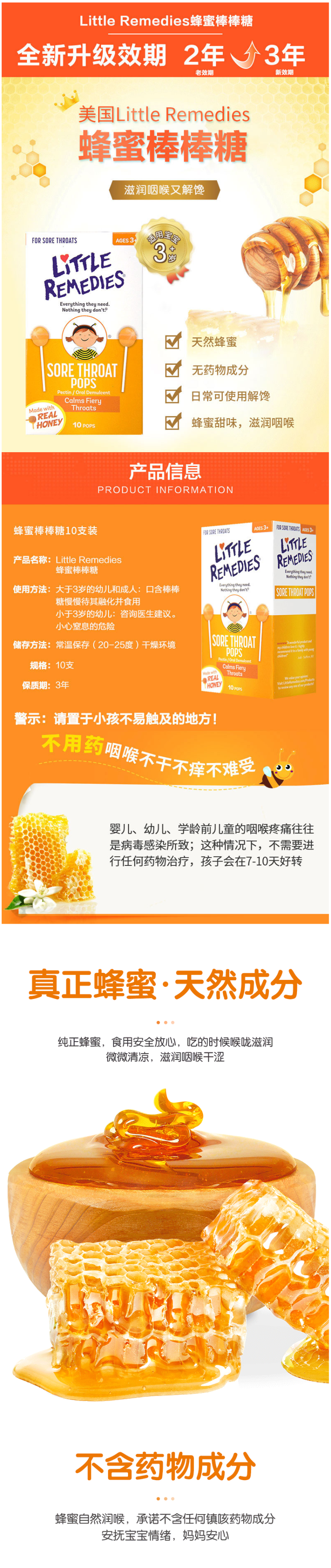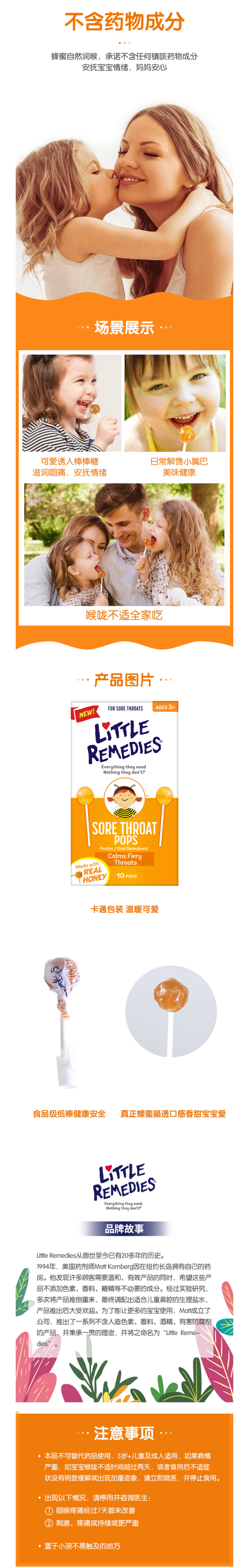这款Little Remedies 儿童天然蜂蜜棒棒糖,美国原装进口,采用天然蜂蜜制成,富含锌和维生素C,可有效缓解孩子因感冒引起的咽喉痛、发痒等不适感,润喉并止咳。采用棒棒糖的形式,孩子喜欢吃,这款是桔子味,味道甜而不腻,不知不觉中治疗孩子的感冒症状,规格是10支*2盒。