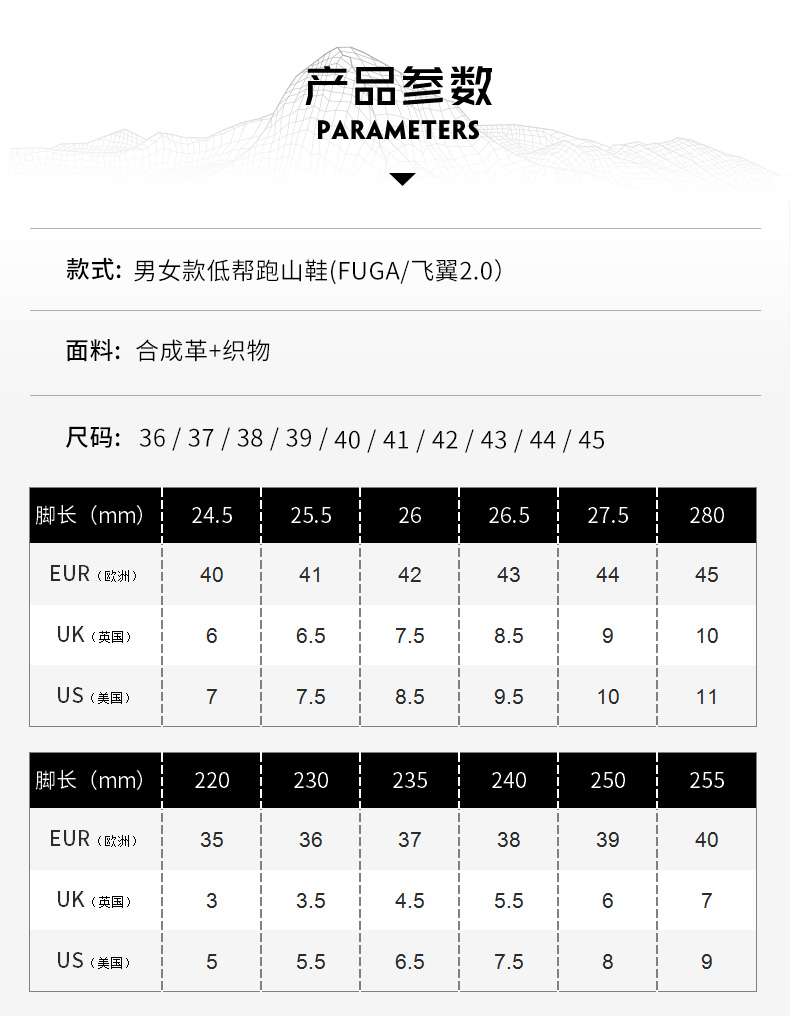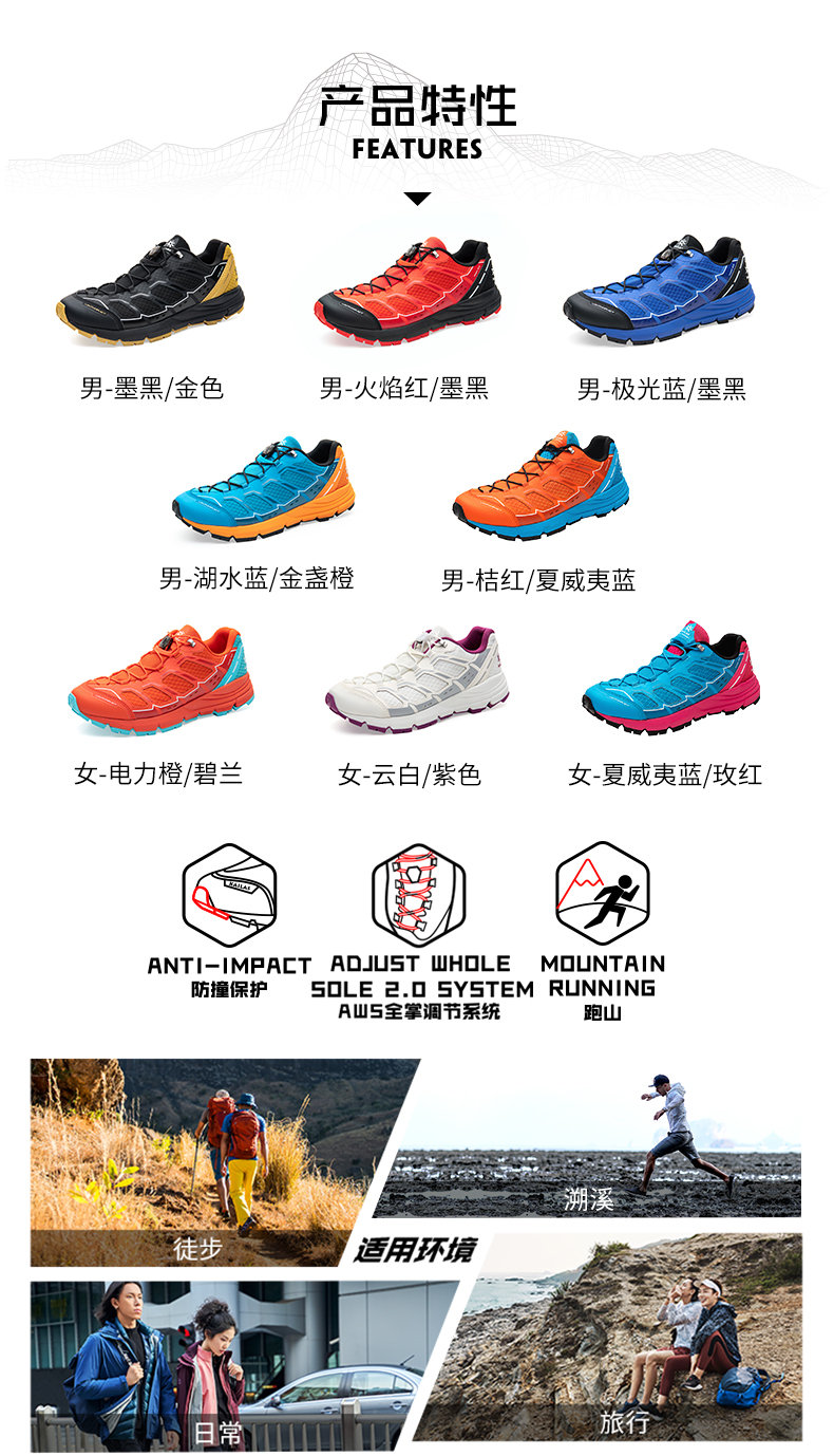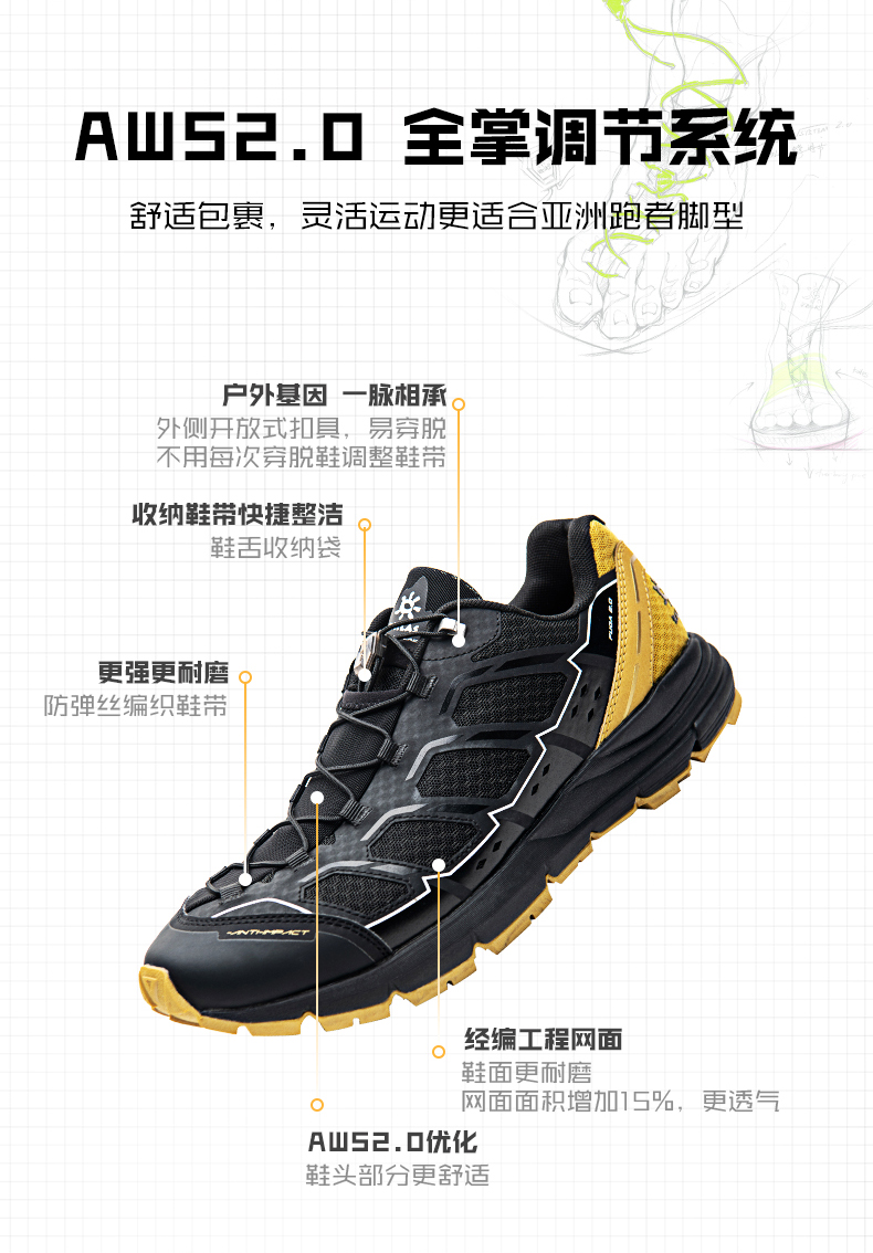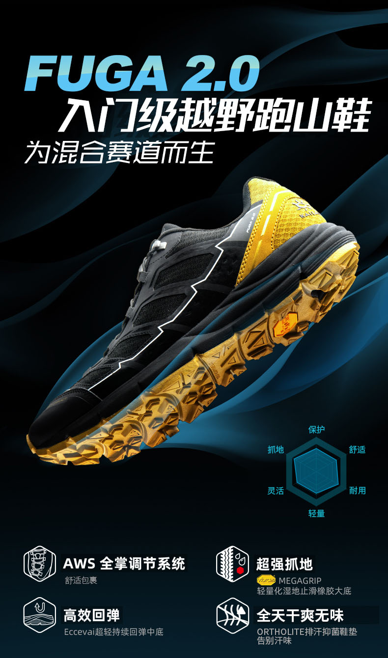 凯乐石 Fuga2.0 越野跑山鞋,AWS2.0全掌调节系统,舒适包裹,灵活运动更适合亚洲跑者脚型,优化鞋头+经编工程网面,结实耐磨防踢撞,网面面积增加15%,增加透气性,穿着更舒适。