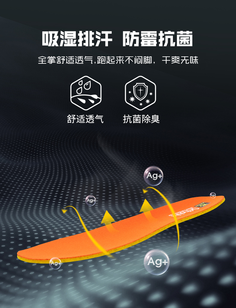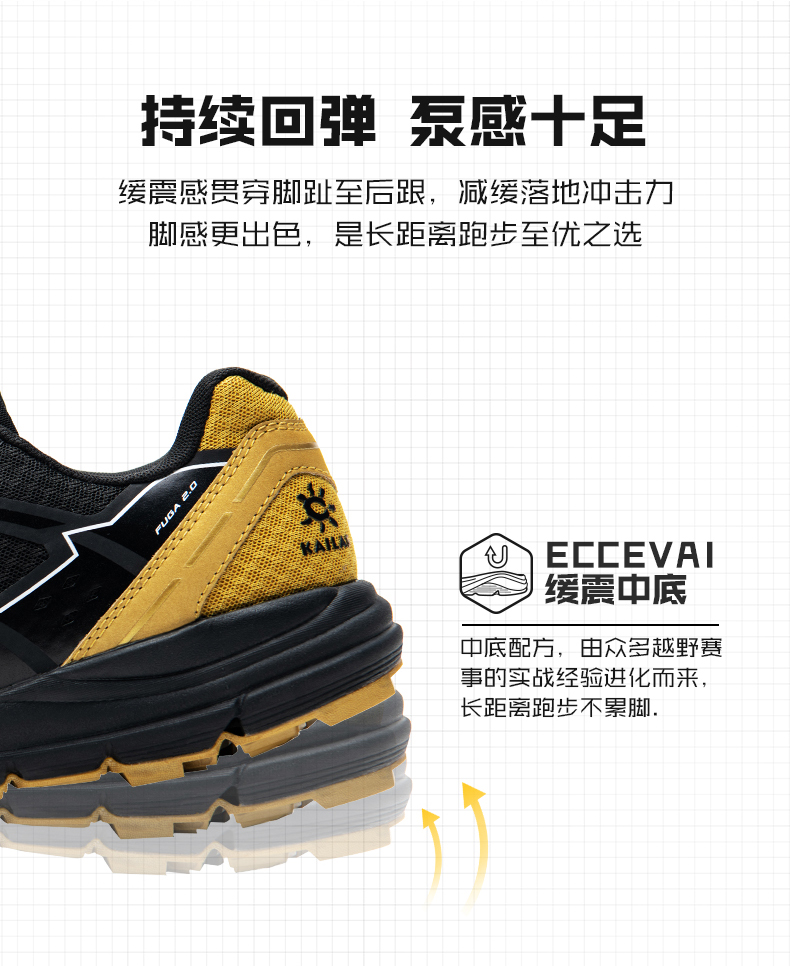 ECCEVAI 缓震中底,配方由众多越野赛事的实战经验进化而来,提供持久回弹,缓震感贯穿脚趾至后跟,减缓落地冲击力脚感更出色,是长距离跑步至优之选。搭配ORTHOLITE抑菌鞋垫,融入银离子、防霉抗菌。全掌舒适透气,跑步不闷脚、长时间保持干爽无异味。