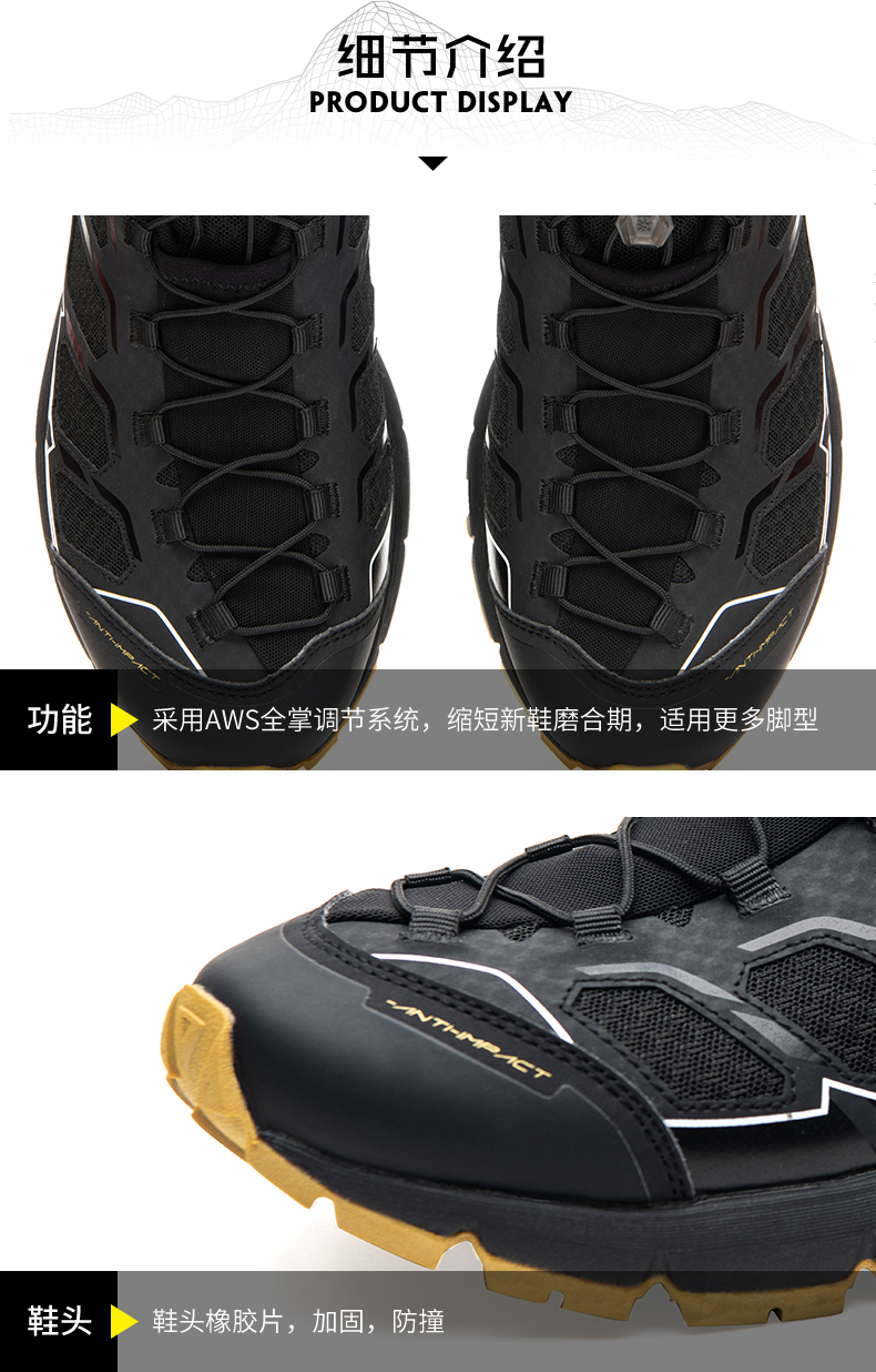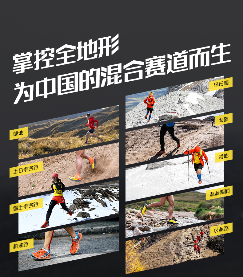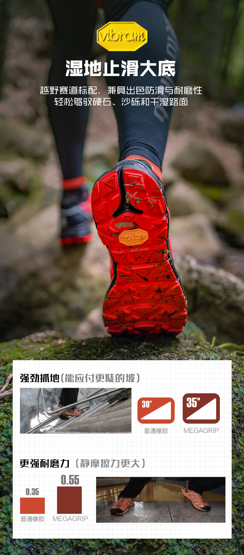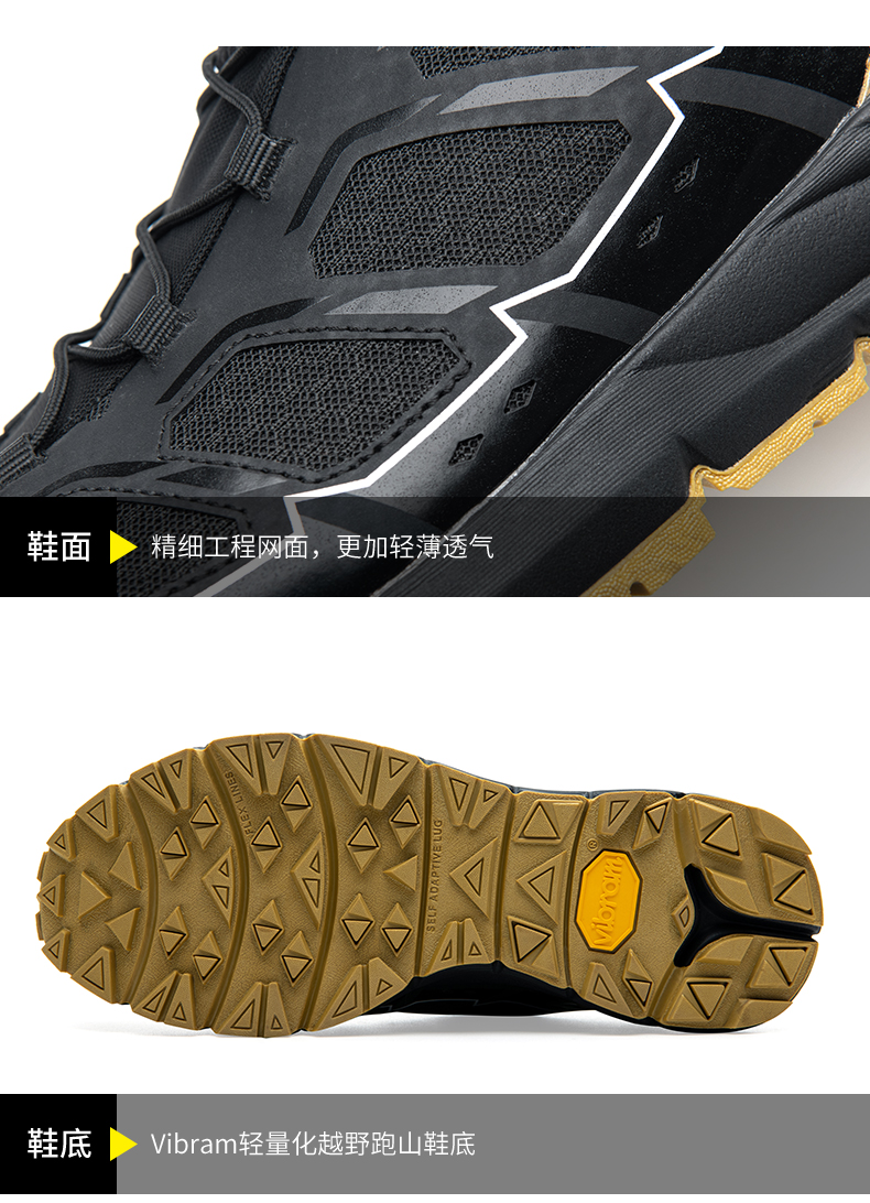 大底采用Vibram黄金大底,轻量化湿地止滑,越野赛道标配,兼具出色防滑与耐磨性,轻松驾驭硬石、沙砾和干湿路面。