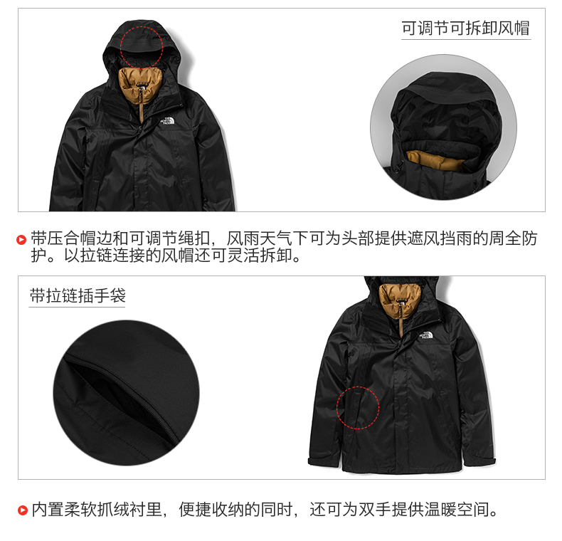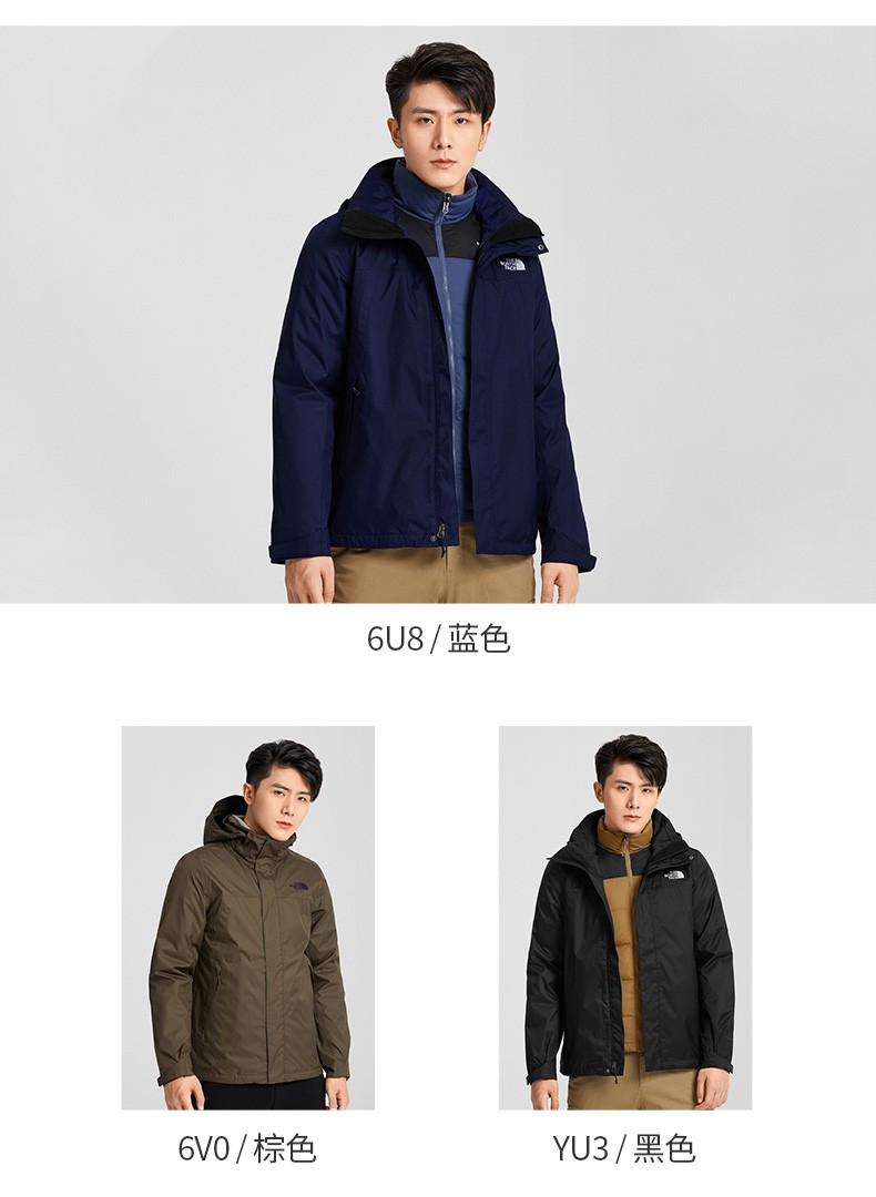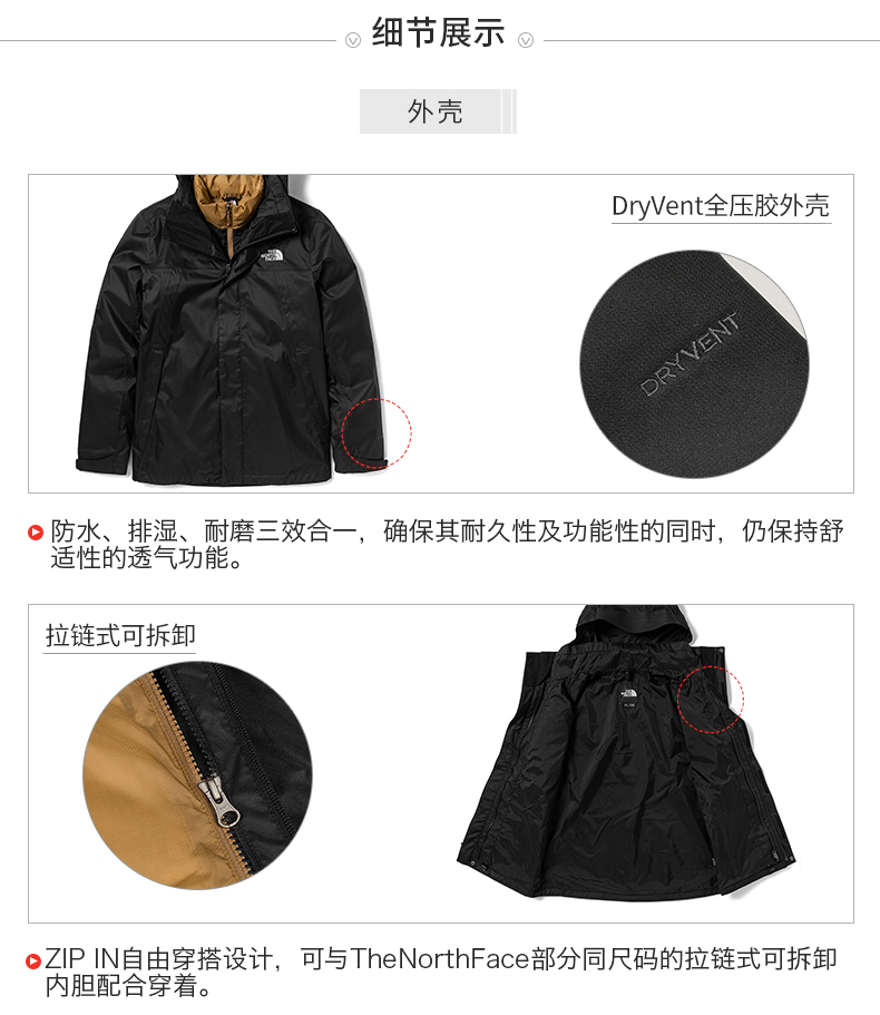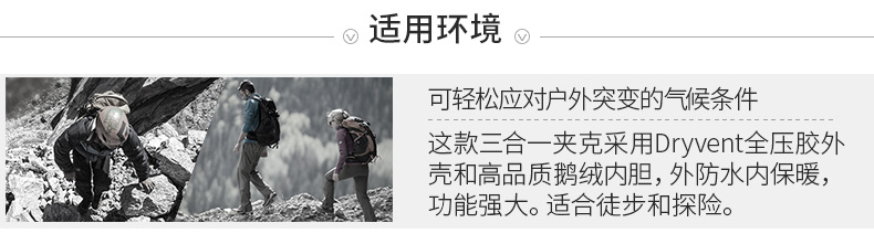 这款 三合一冲锋衣,高性价比经典款式,冲锋衣外壳DryVent全压胶处理,防水、排湿、耐磨三效合一,确保其耐久性及功能性的同时,仍保持舒适性的透气功能,且具有良好的防风性能,不惧大风、雨雪天气,满足户外出行需求,面料厚度柔软度适中,穿着也非常舒适,日常都市穿搭也是不错选择,