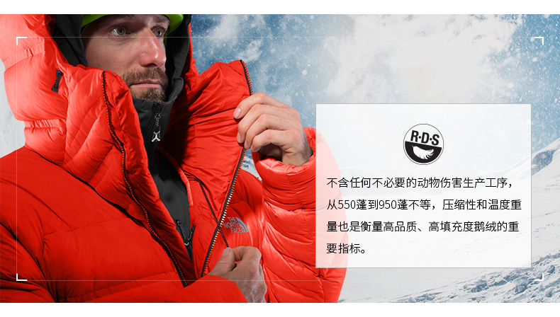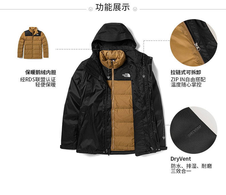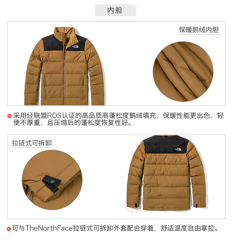 羽绒服内胆采用RDS联盟认证高品质高蓬松度鹅绒填充,压缩后也能快速恢复蓬松状态,轻便不厚重,具有出色的保暖性能。ZIP IN自由穿搭设计,可单独外穿,也可与TheNorthFace部分同尺码的拉链式可拆卸内胆配合穿着。