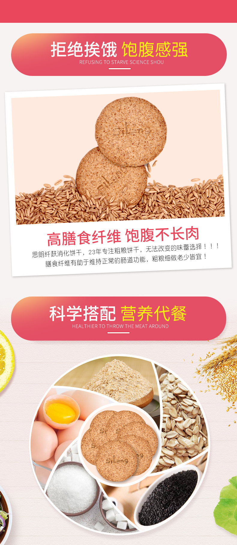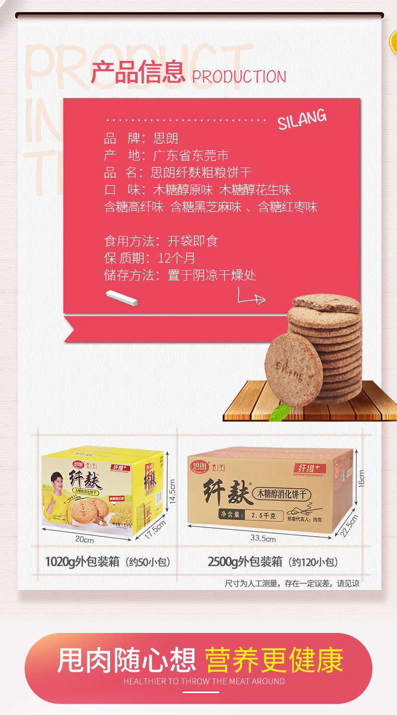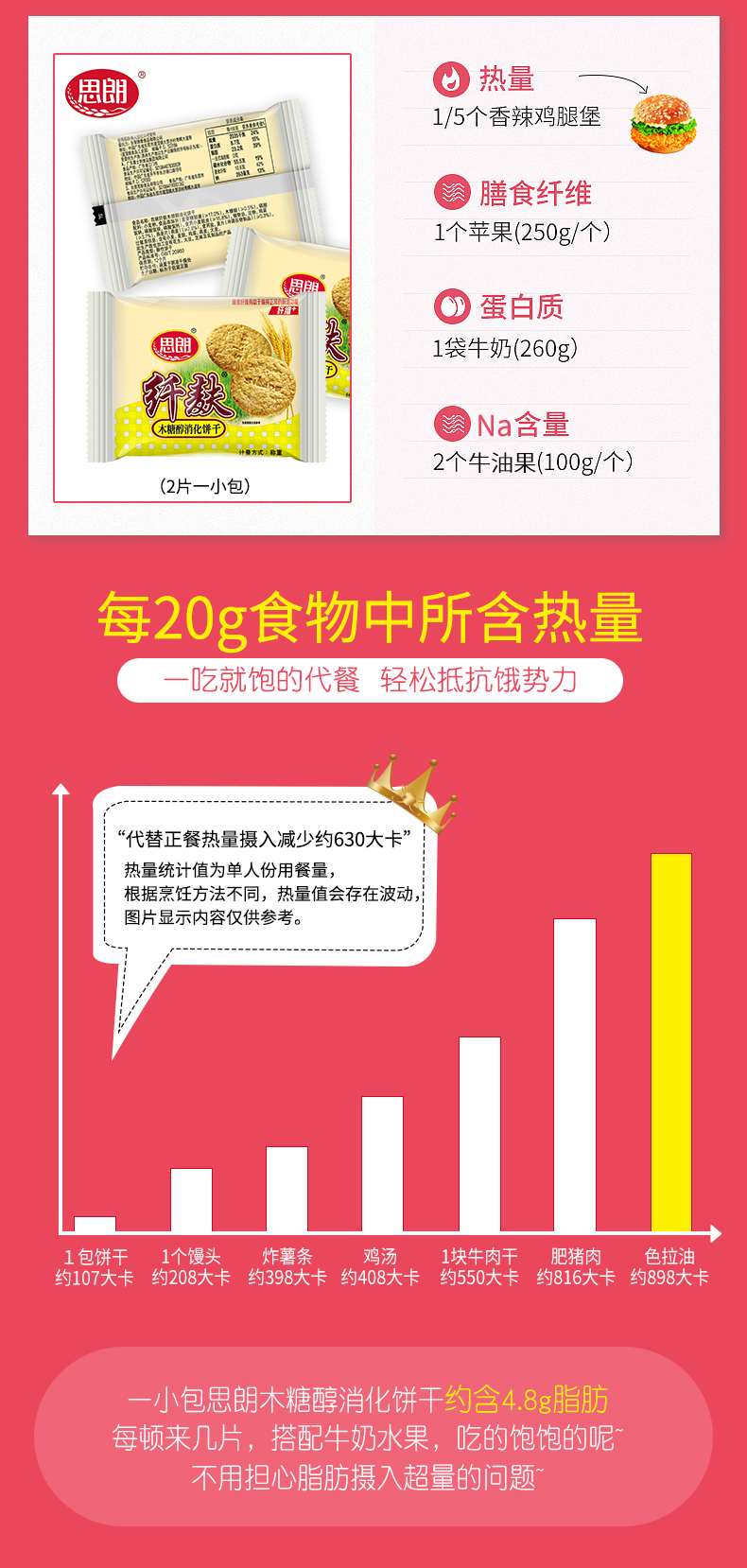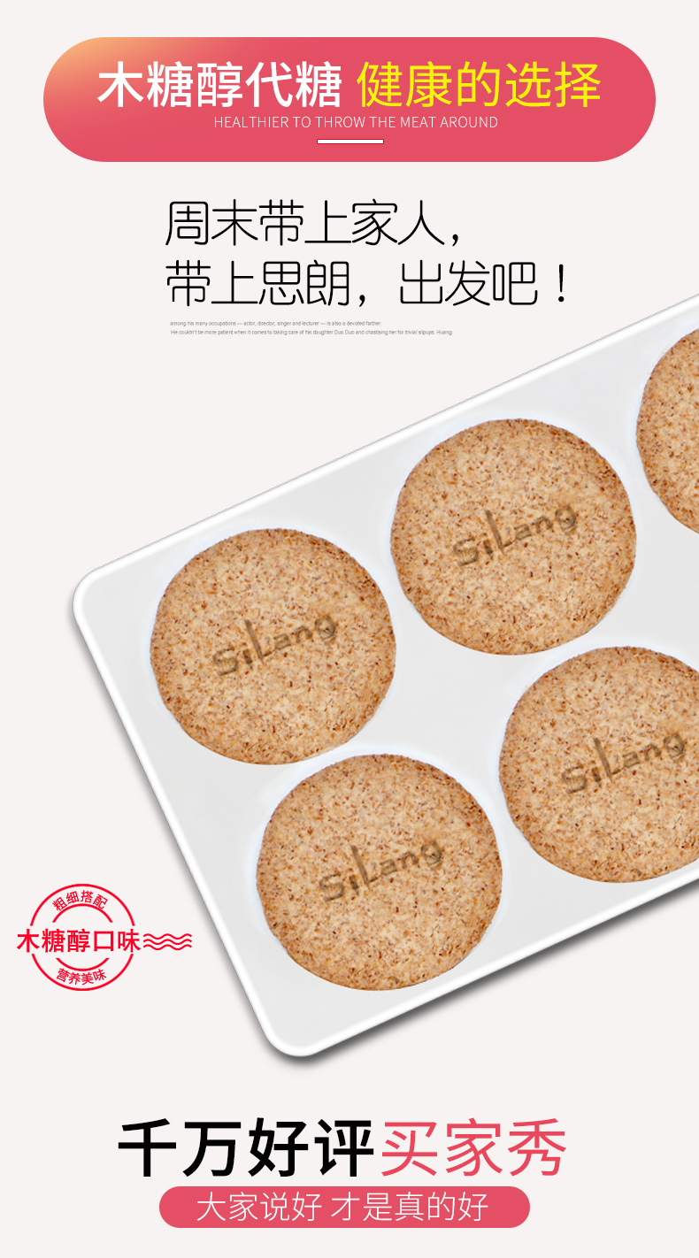 款思朗纤麸粗粮饼干,由上等小麦粉、新鲜鸡蛋、植物油、麦麸组成,口感松酥,味道香美,富含丰富的粗粮膳食纤维,高饱腹,不怕胖,能够促进消化。