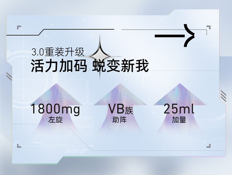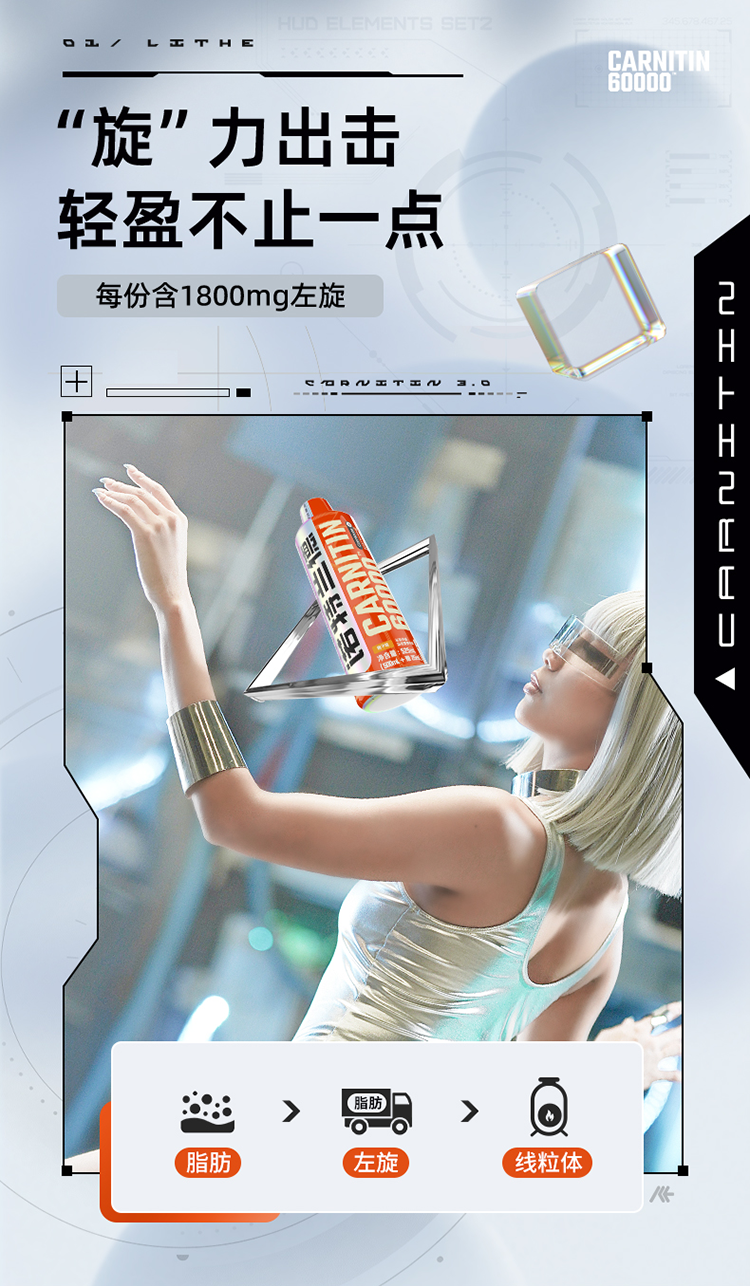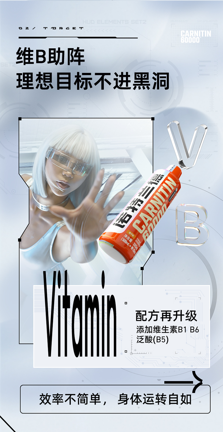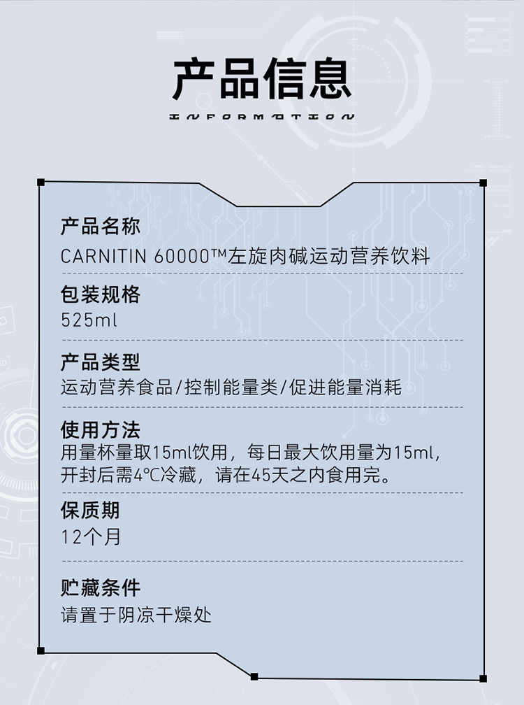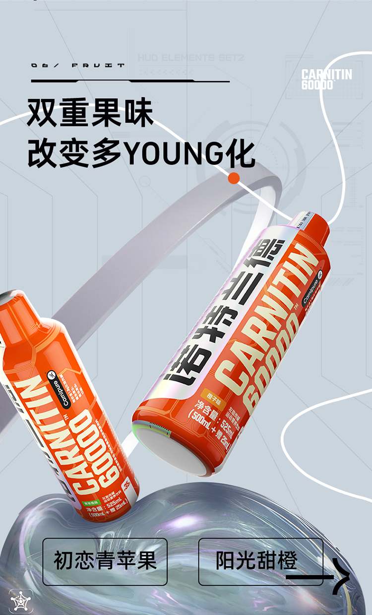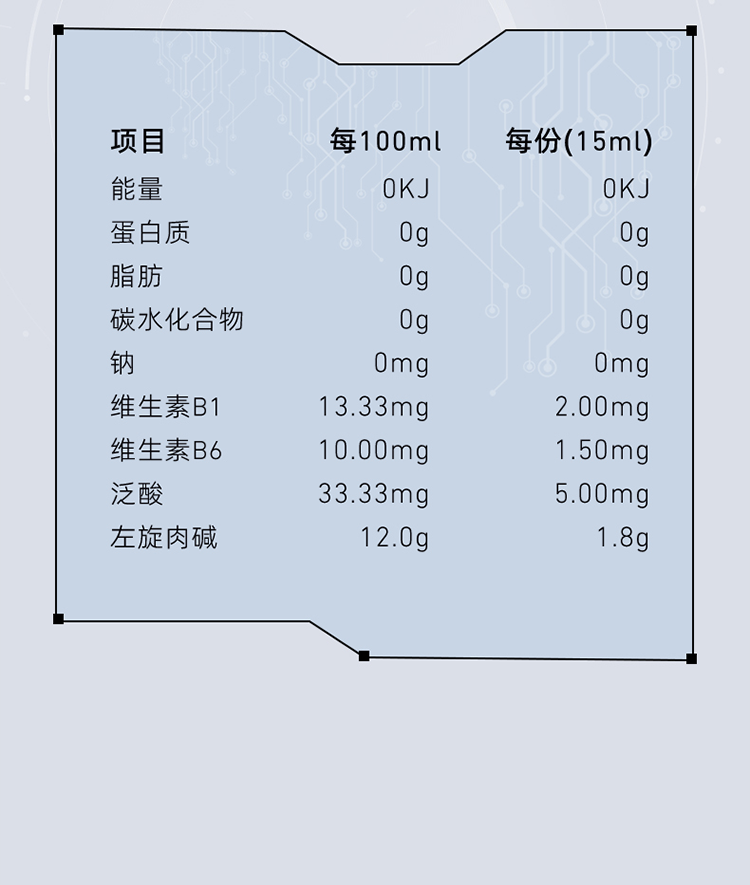 每10ml含有600mg左旋肉碱,纯度高达99.99%,同时人体的吸收率也达99%,0糖分,0热量,0咖啡因。维生素B族协助脂肪在线粒体中分解燃烧,缓解身体疲劳、补充精力;柑桔提取物能加速代谢,深层瓦解顽固部分,有效抑制食欲,预防能量过剩。