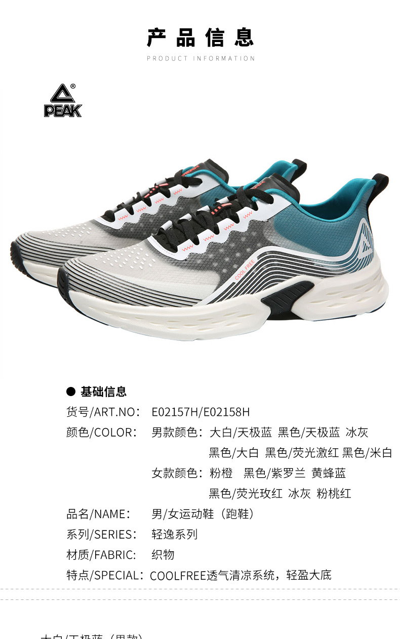鞋面是搭载COOL FREE科技的冰感透明纱材质,轻灵透气,保持更强的透气性能,其它的细节方面,中底融合了轻质TPU,保持中底在运动时的稳定性和抗扭性,鞋底分块橡胶材质,防止中底的过度磨损,提高整鞋的耐用性。