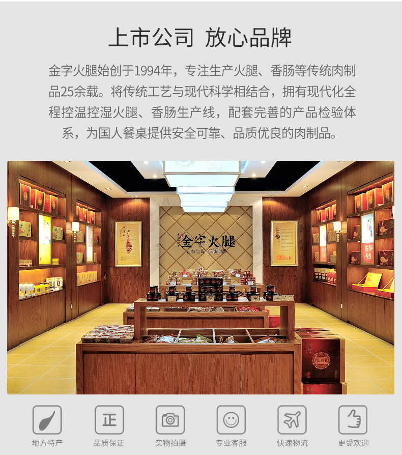 金字火腿股份有限公司创办于1992年8月,2004年被认定为“浙江省科技农业企业”,2010年12月3日,成为业内首家A股上市公司,股票代码:002515。同时公司也是《地理标志产品 金华火腿》国家标准主要起草单位、国内首个发酵肉制品标准制订者。