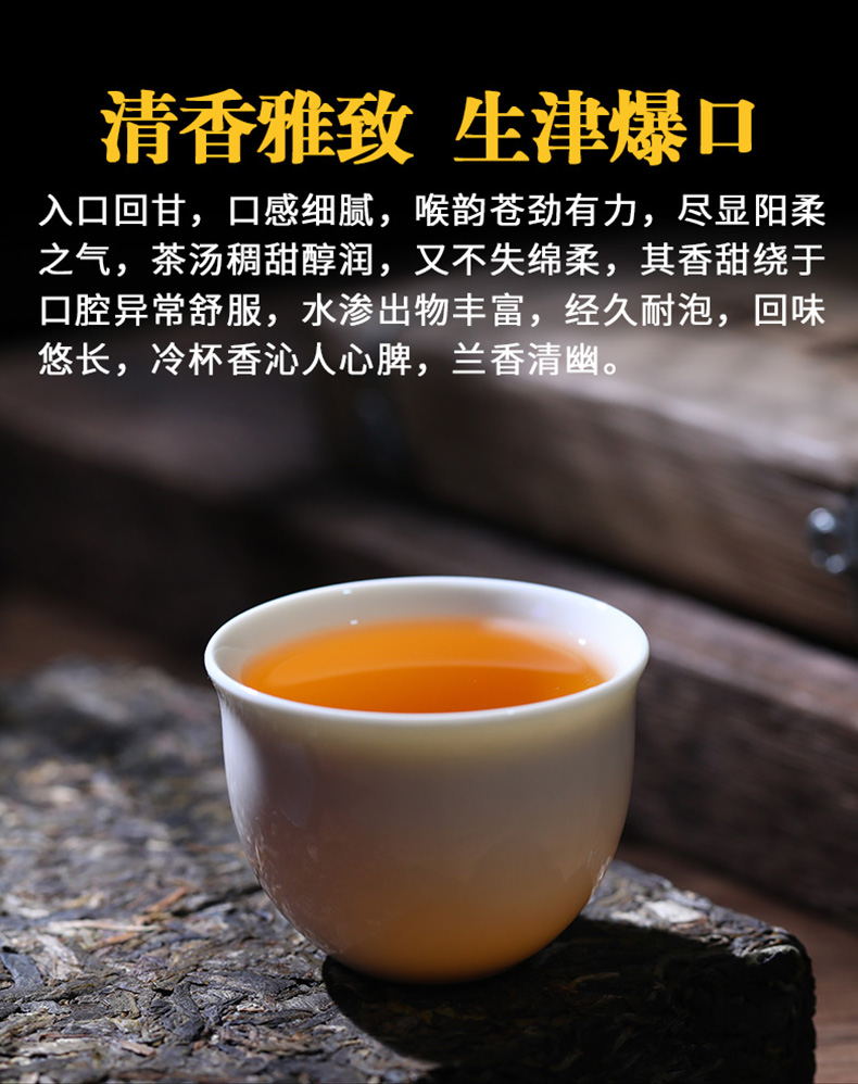 茶汤金黄通透,因其内质丰富,故而口感浓烈甘甜与外地茶相比,冰岛茶叶的水浸出物高出3-5个点,自带甜润基因,蜜甜在口腔中弥漫,鼻息呼出亦有,让人总是忍不住多喝几口,久久不想放下手中茶杯。