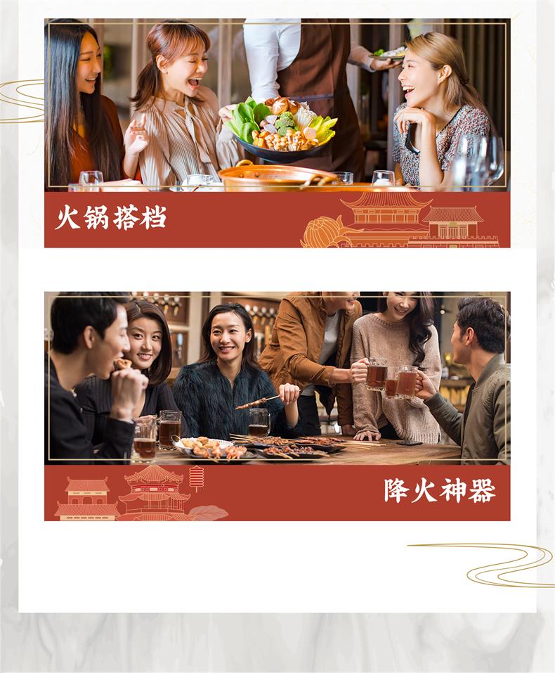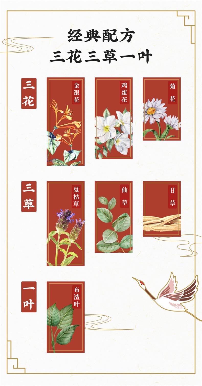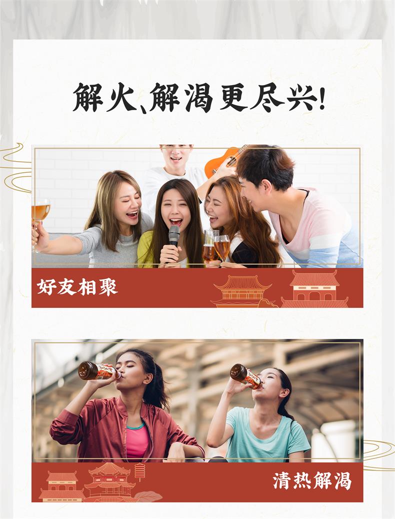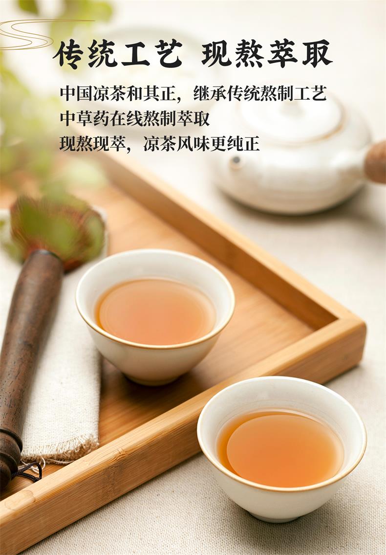 和其正 中国传统凉茶,经典三花三草一叶植物配方,金银花、鸡蛋花、菊花、夏枯草、仙草、甘草、不渣叶,采用科学配比,继承传统熬制工艺,中草药在线熬制萃取现熬现萃,凉茶风味更纯正。