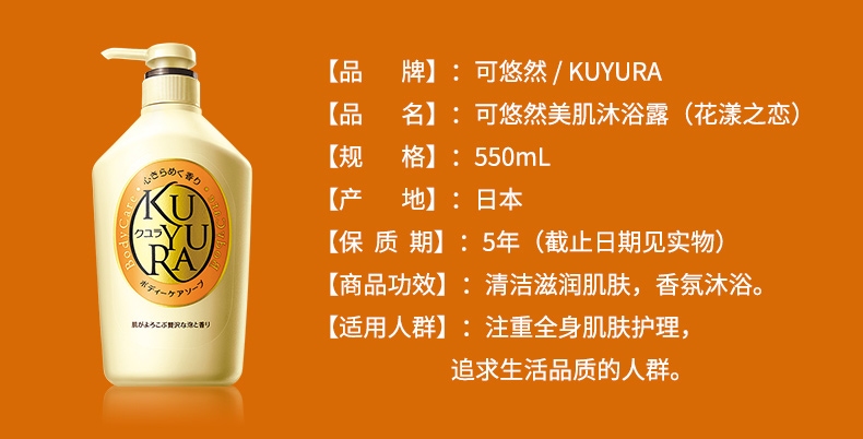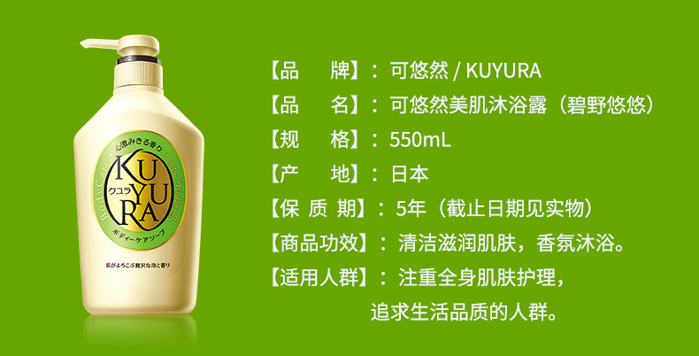 可悠然KUYURA,是资生堂集团旗下的原装进口沐浴露品牌,创立于2008年,含有肌肤护理成分的香芬及泡沫萦绕全身并清洁肌肤,让身体肌肤拥有与面部肌肤同等级别的护理。