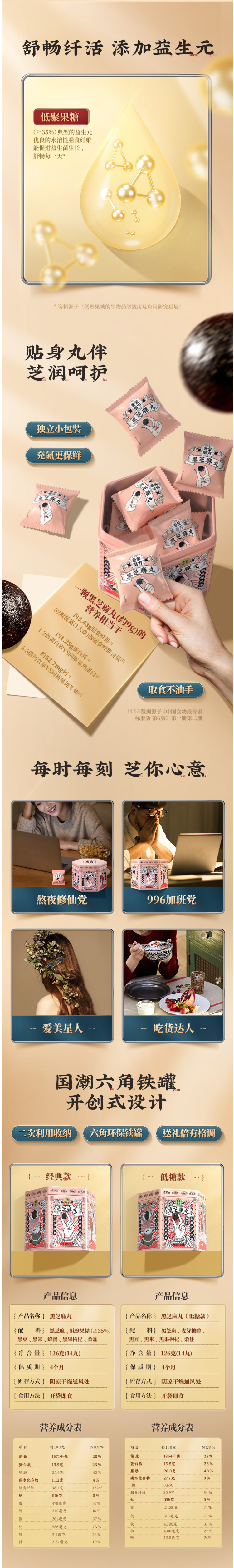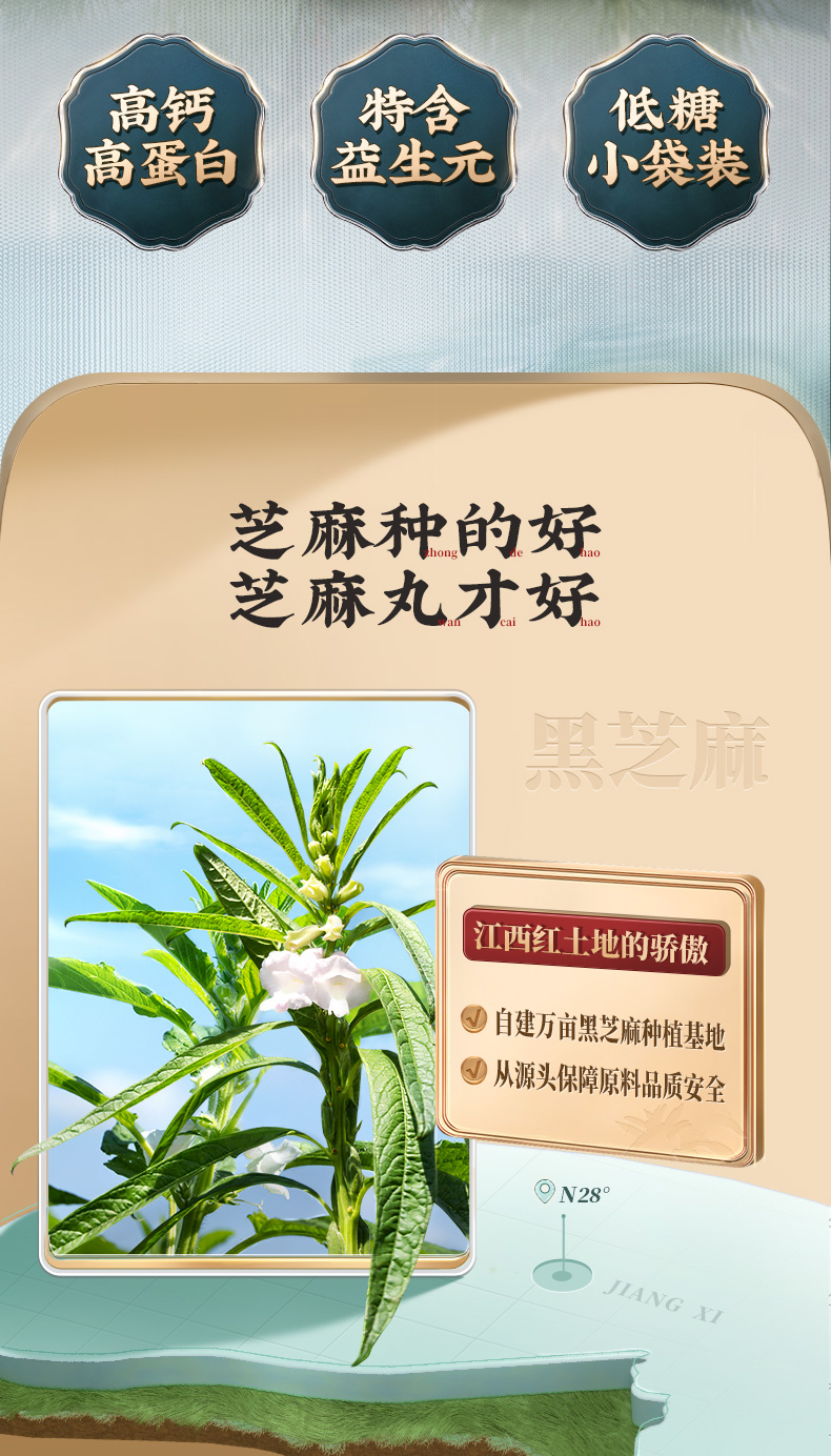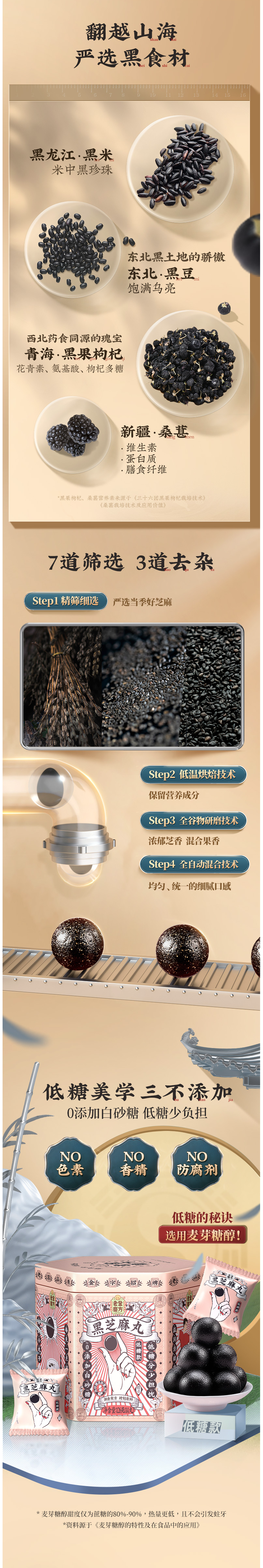 选用当季黑芝麻,颗粒饱满,干净无杂质,香脆美味,清洗后高温烤制需要把握精准的火候;用蜂蜜代替糖调制蜜丸,口感稍甜却不腻,蜂蜜清润细腻,不粘牙。单颗独立包装,充氮保鲜。
