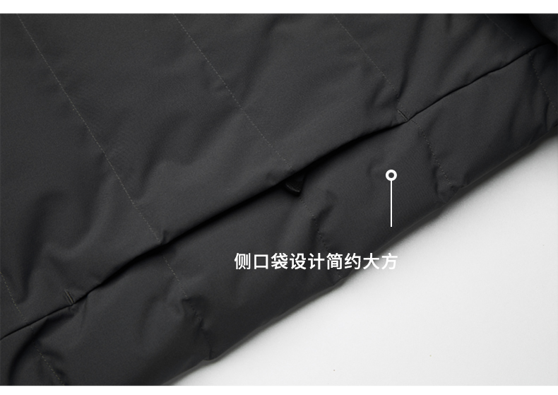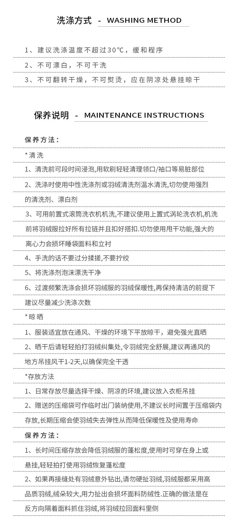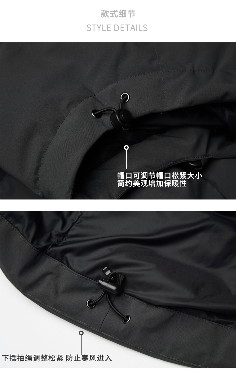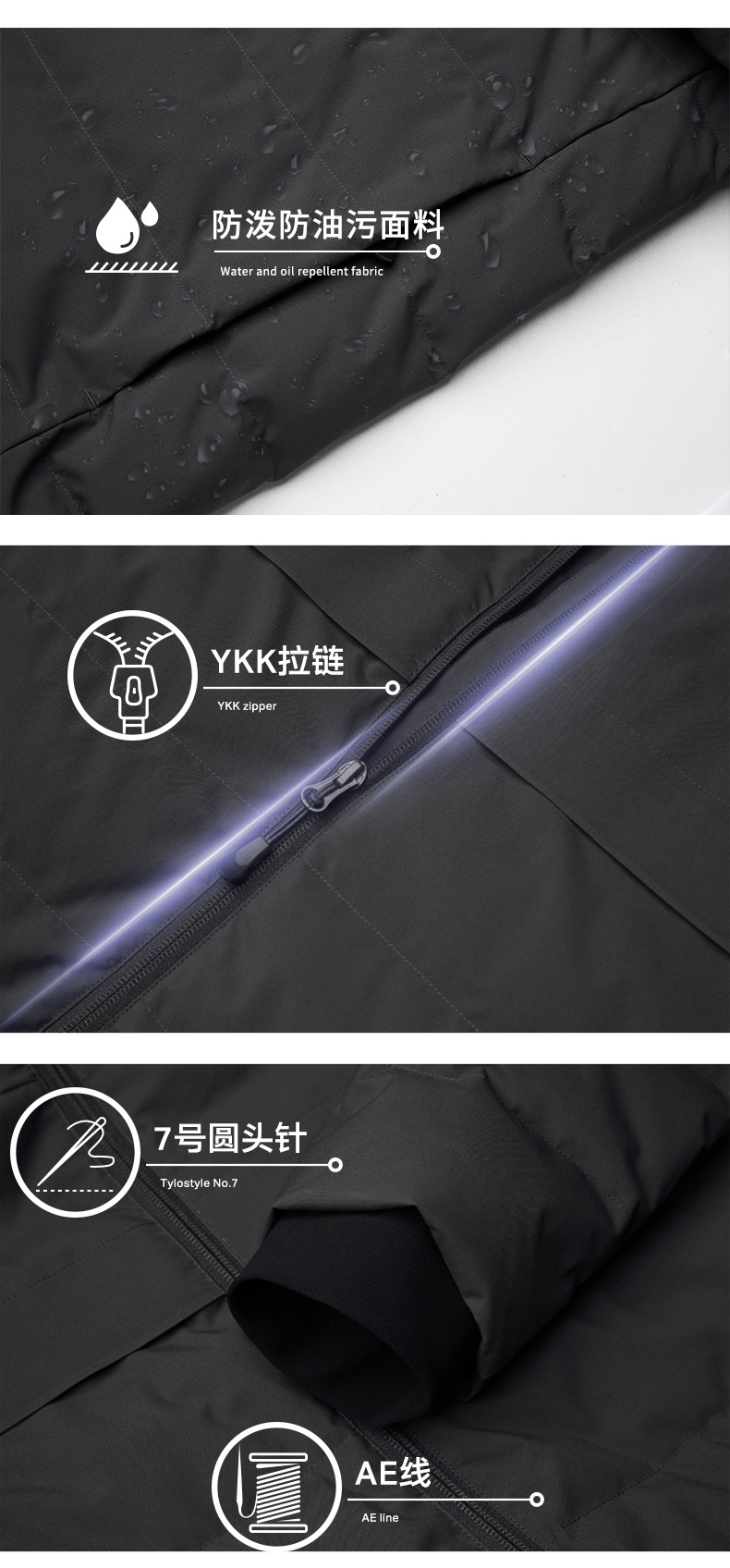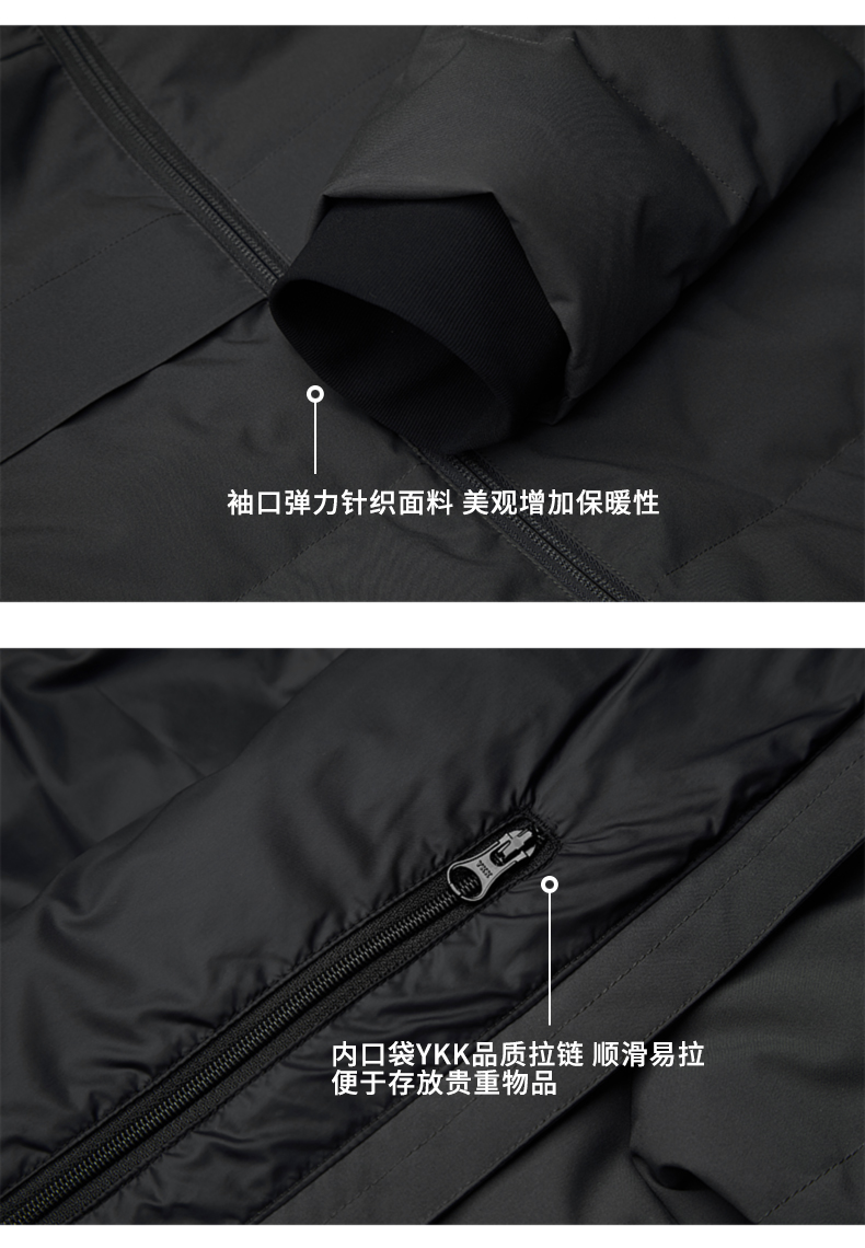 外观夹克型设计,上身利索不臃肿,短款版型显腿长,在帽口和下摆都设计了抽绳,袖口增加了一块弹力针织面料,都是防止寒风灌入,保证其保暖性,所有口袋的拉链都是YKK拉链,顺畅耐用,线材也都是选用的美国A&E公司的缝纫线,最大程度的防止钻绒,力求每个细节都完美。